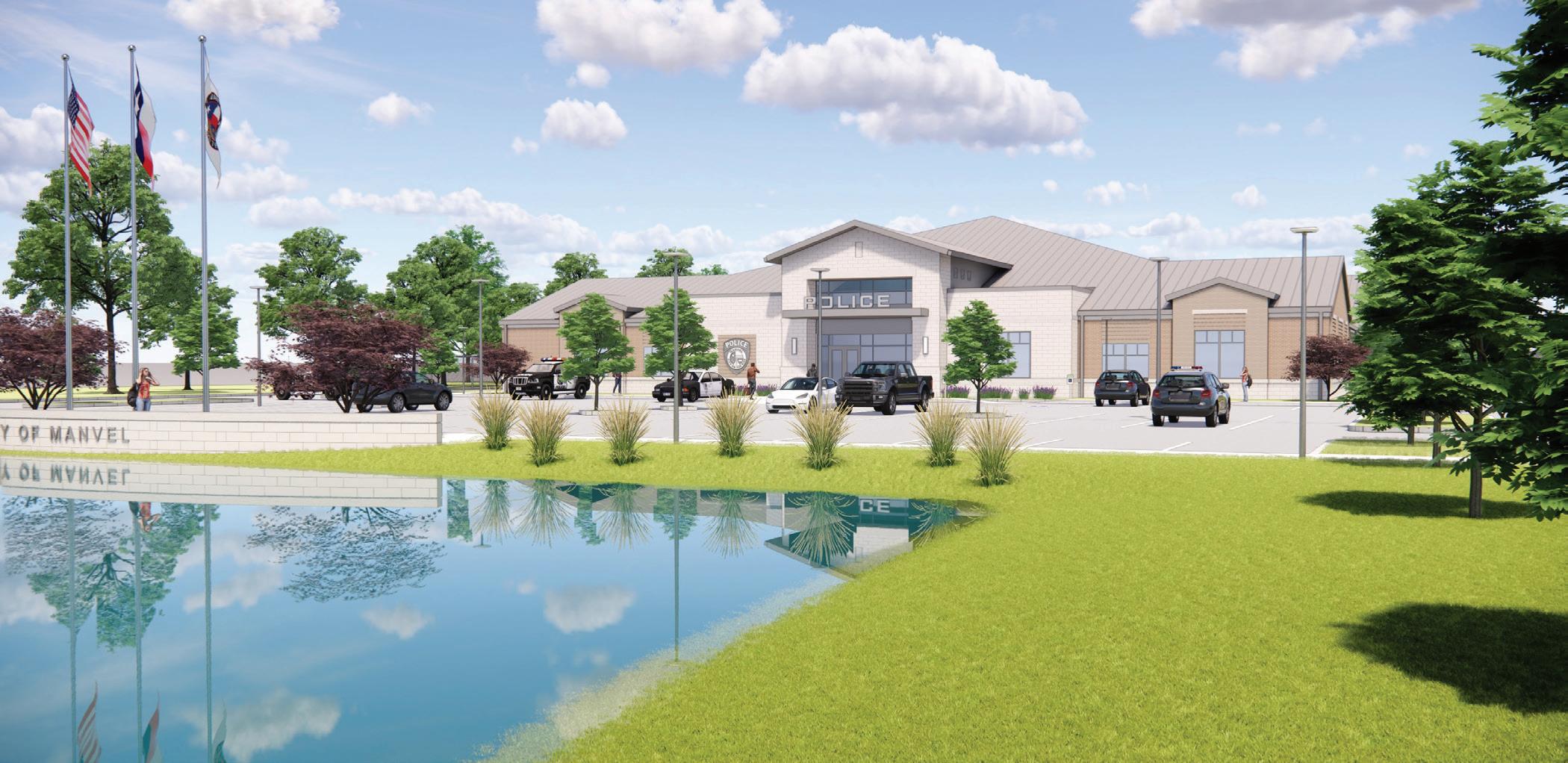 The proposed City of Manvel Police Station will be on an 8.64-acre site at 6615 Masters Road in Manvel, Texas. The project will consist of the construction of an approximate 45,000-square-foot police station building containing various police departments, an EOC, a community room, evidence processing and storage areas, a jail with 10 holding cells and four-car vehicular sallyport, various building support areas, and a standalone 1,250-square-foot animal shelter located near the rear of the site.