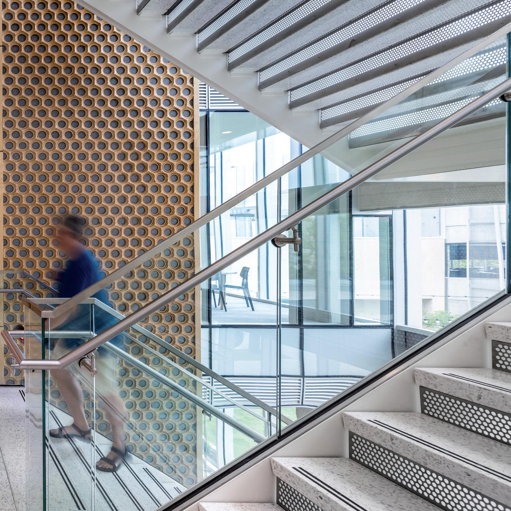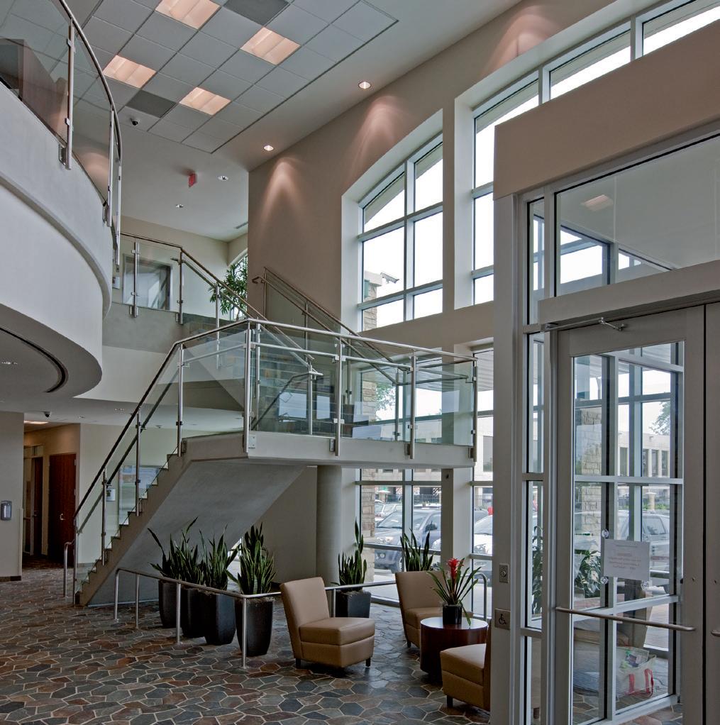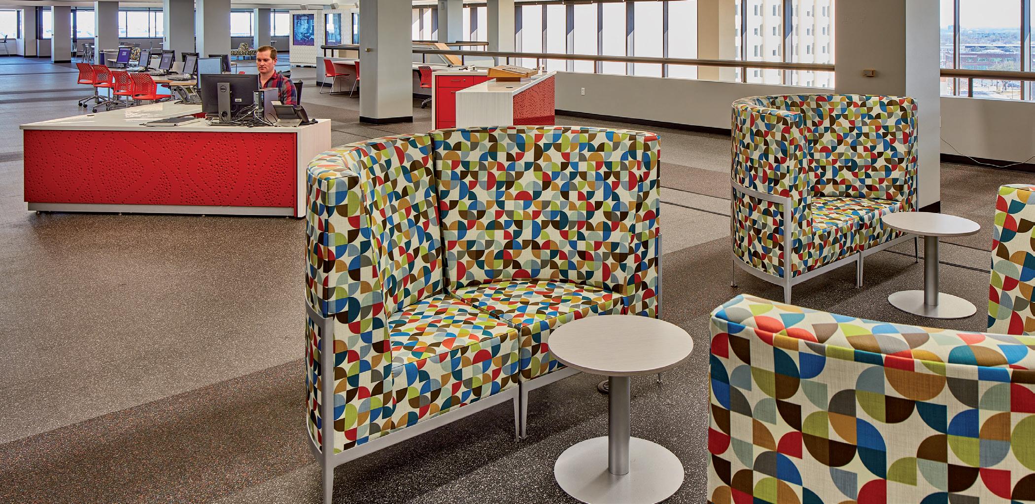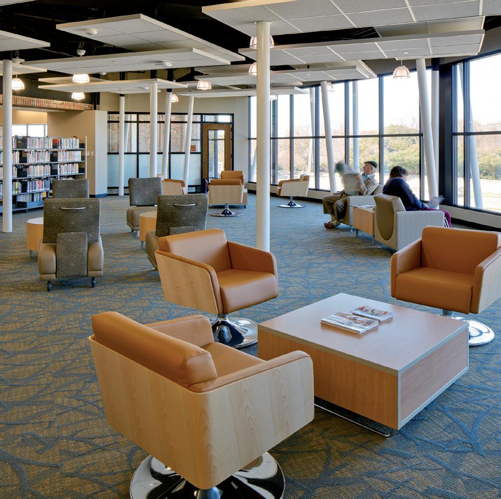 The lobby is uniquely designed for 24/7 access to critical resources like computers, workstations, and media holds. Extensive glazing frames the landscape while providing, promoting a safe and welcoming environment.