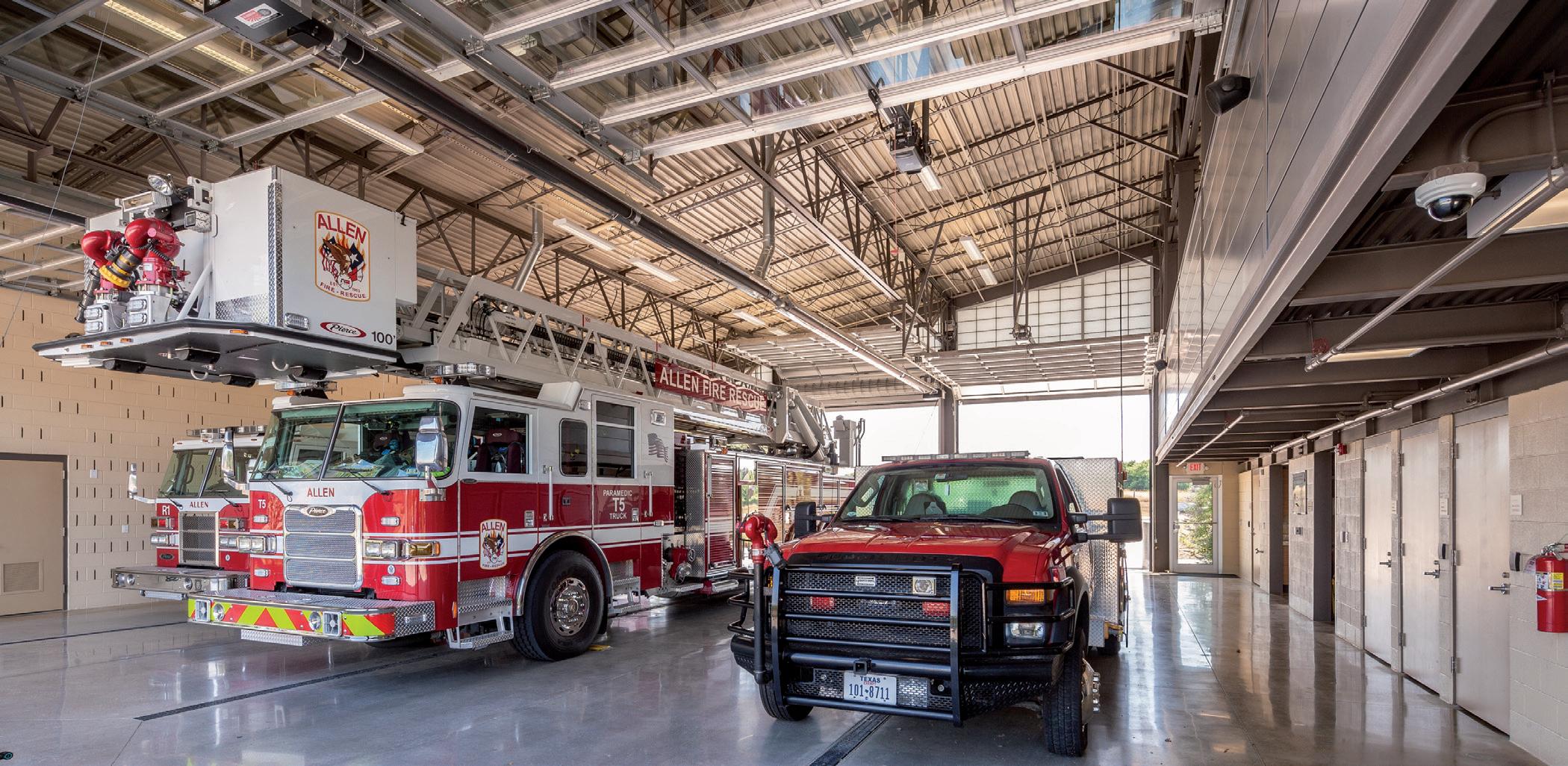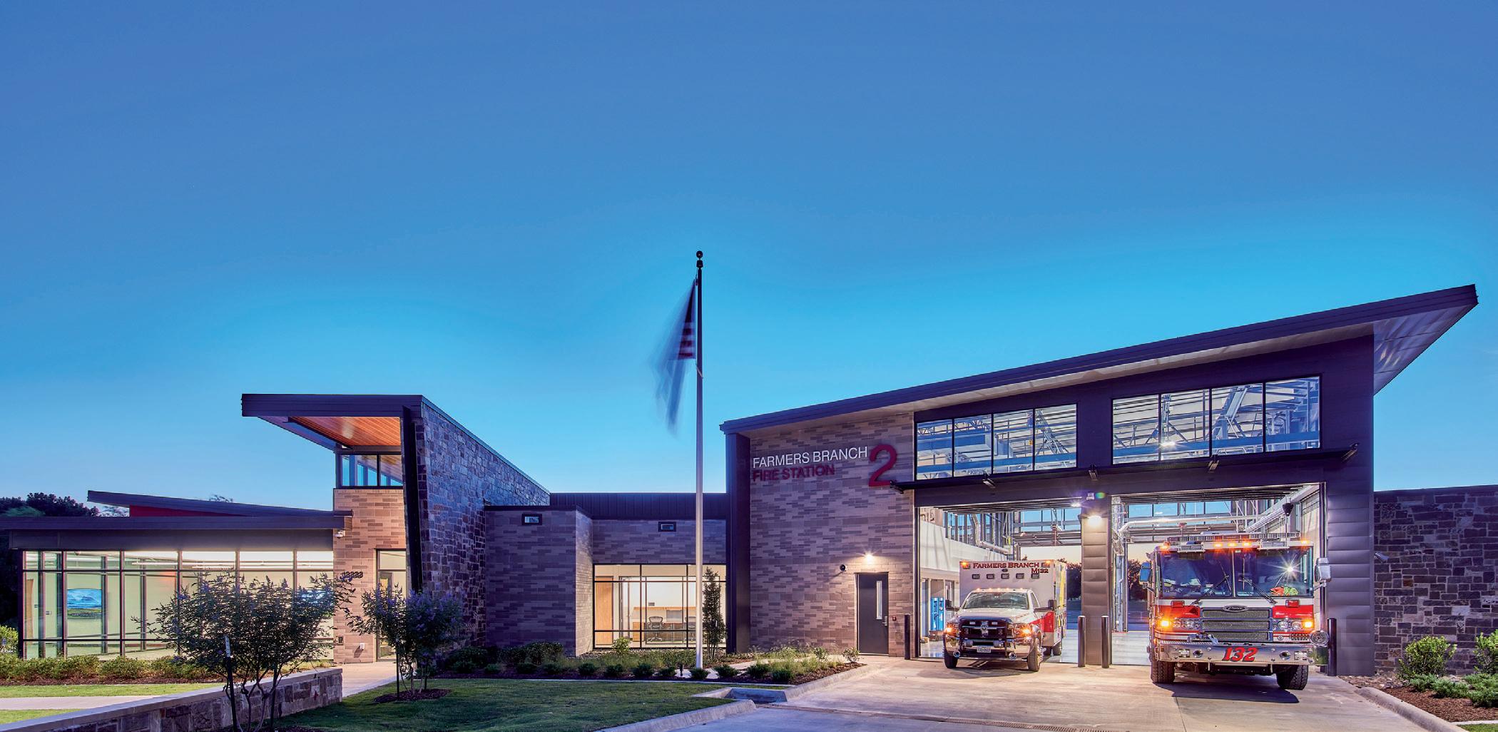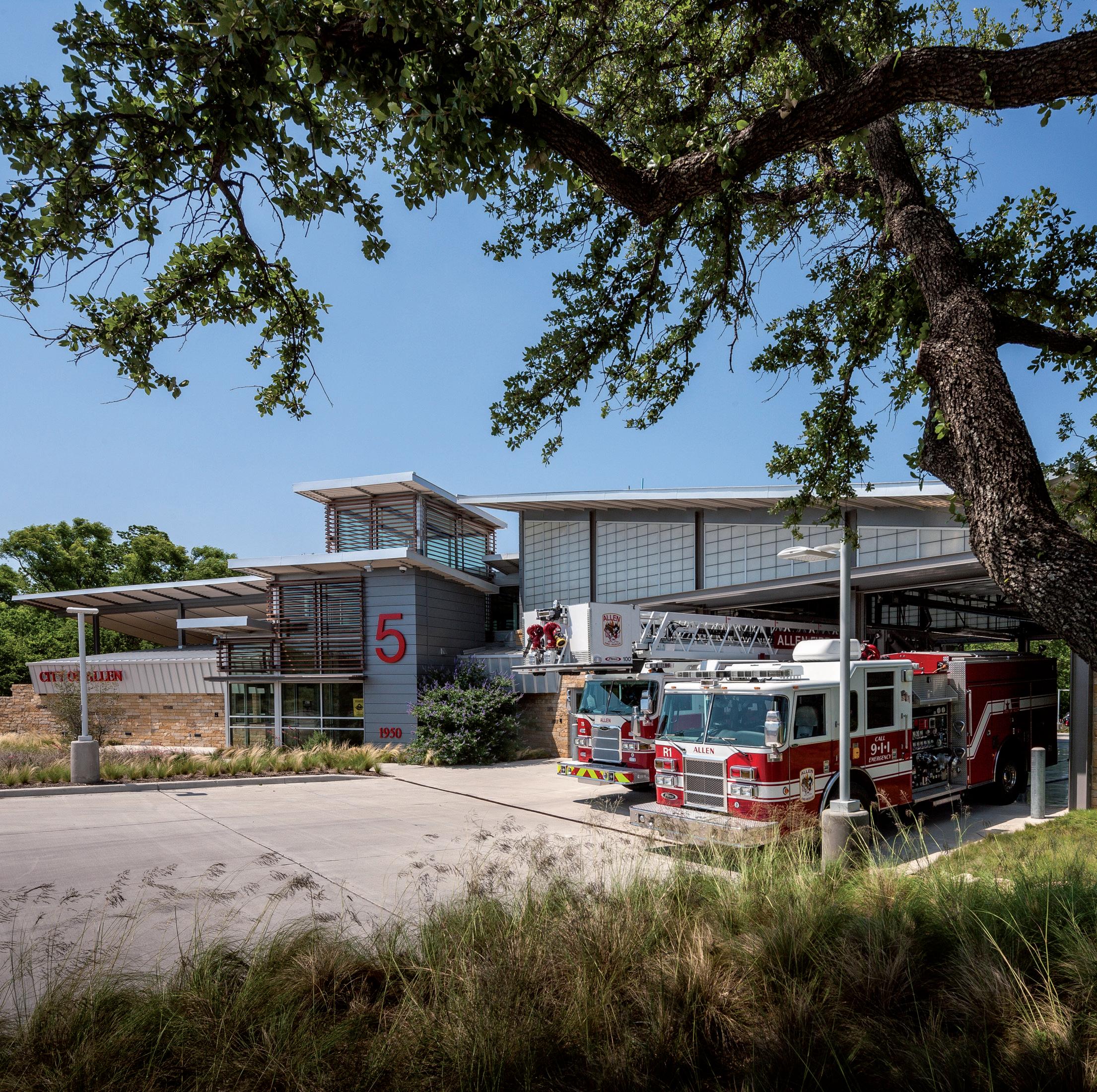 Coppell Fire Station No. 5 is a new, two-bay facility designed to serve an established residential neighborhood. The 12,000-square-foot station accommodates a tractor-drawn aerial apparatus, battalion chief vehicle, and reserve unit. It supports a seven-person crew, including two officers.