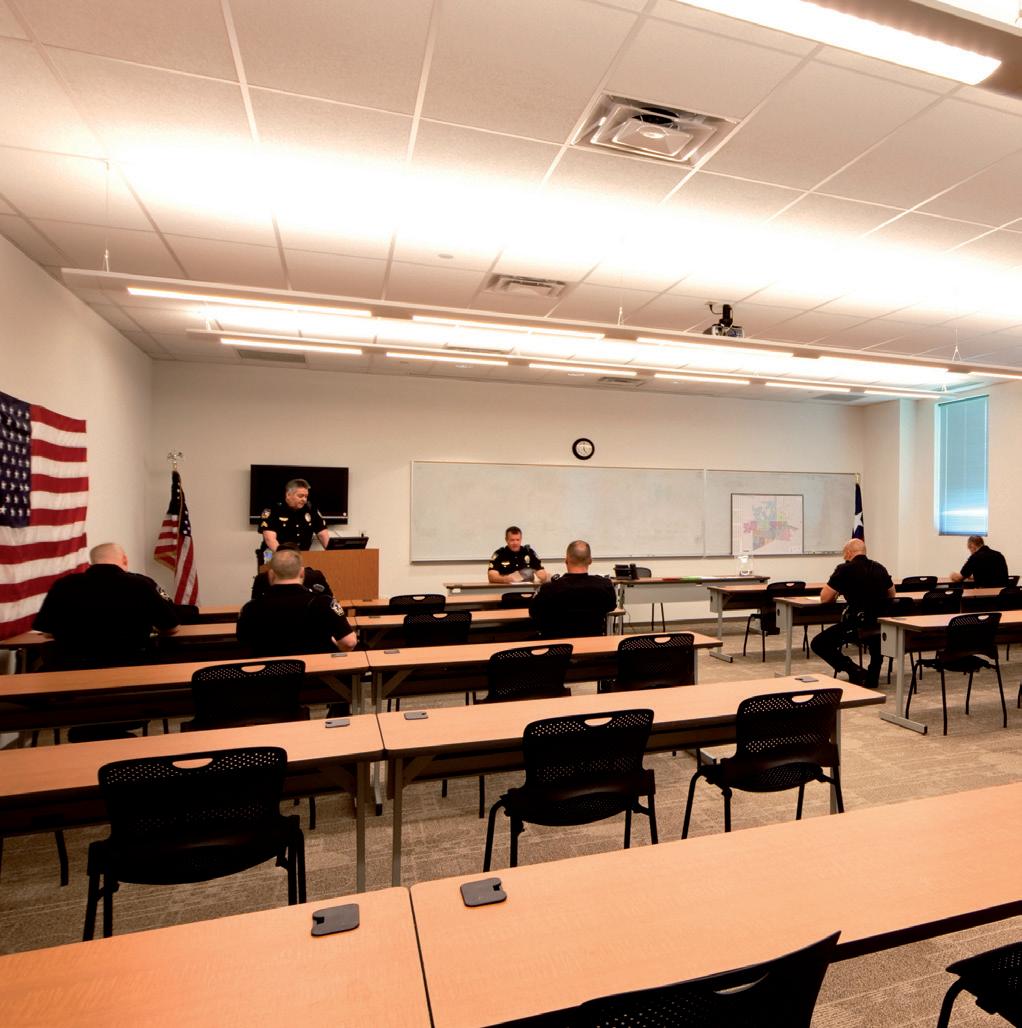 The L-shaped first floor includes a community media room, training areas, lockers, and support spaces for patrol and general police operations. The adjacent onestory back-of-house structure supports higher-volume, mission-critical functions such as evidence and property storage, and includes a forensics vehicle bay.