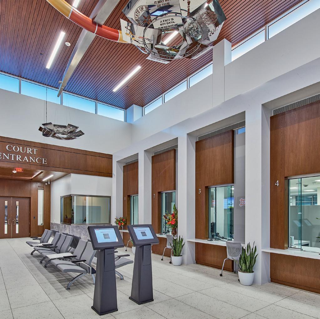 The 94,000-square-foot complex includes administrative offices, conference rooms, security rooms, a jail, a firing range, an emergency operations center, 9-1-1 dispatch, and forensic labs. Designed to support modern law enforcement operations, the facility balances security, transparency, and flexibility.