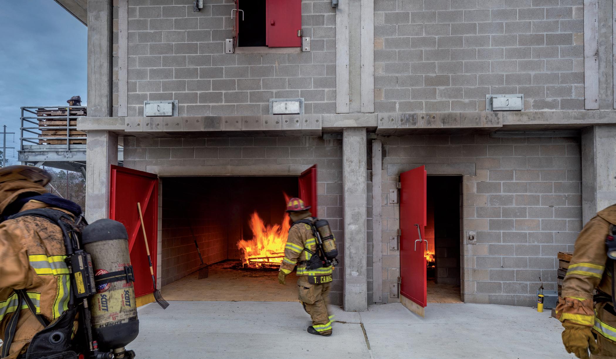 The burn building simulates both residential and commercial occupancies, offering 12 fully functional rooms for live fire training. This setup enables firefighters to practice fire suppression, search-and-rescue operations, and interior firefighting techniques under realistic conditions.