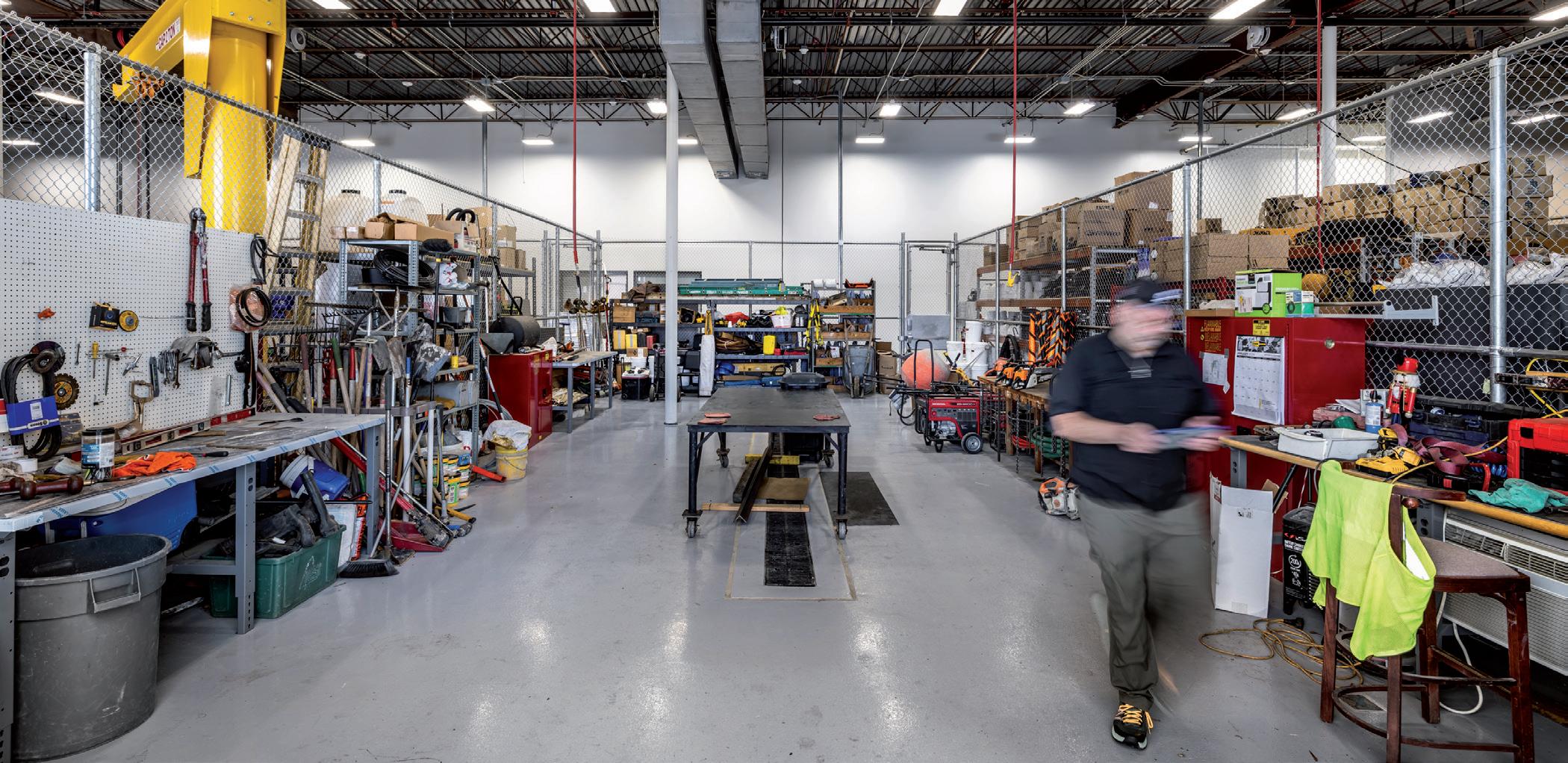 The renovation converts the large retail shell into a multifunctional civic facility including housing offices, conference rooms, lunchrooms, fitness areas, and mechanical work bays for equipment maintenance. PGAL
