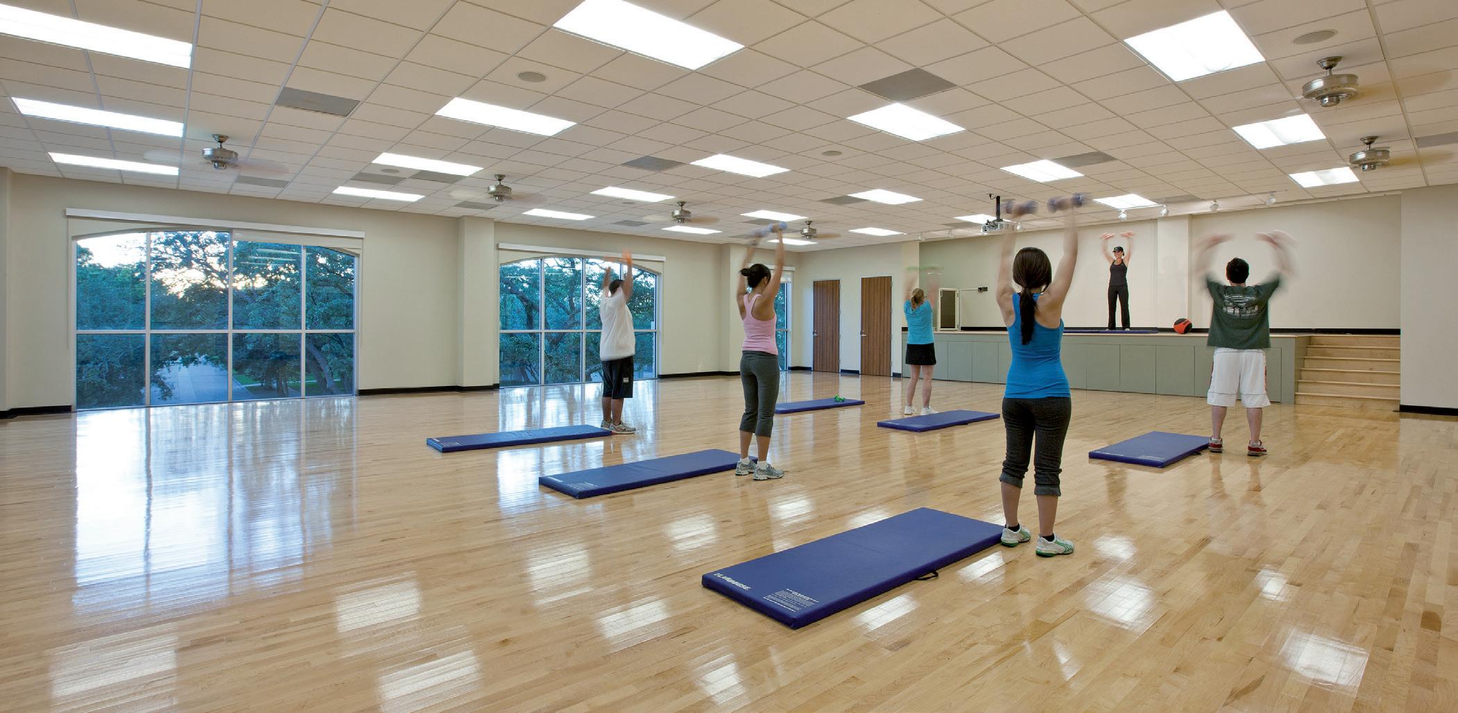 glass wall separates the weight room from the adjacent classroom, providing sound control without visual disruption.