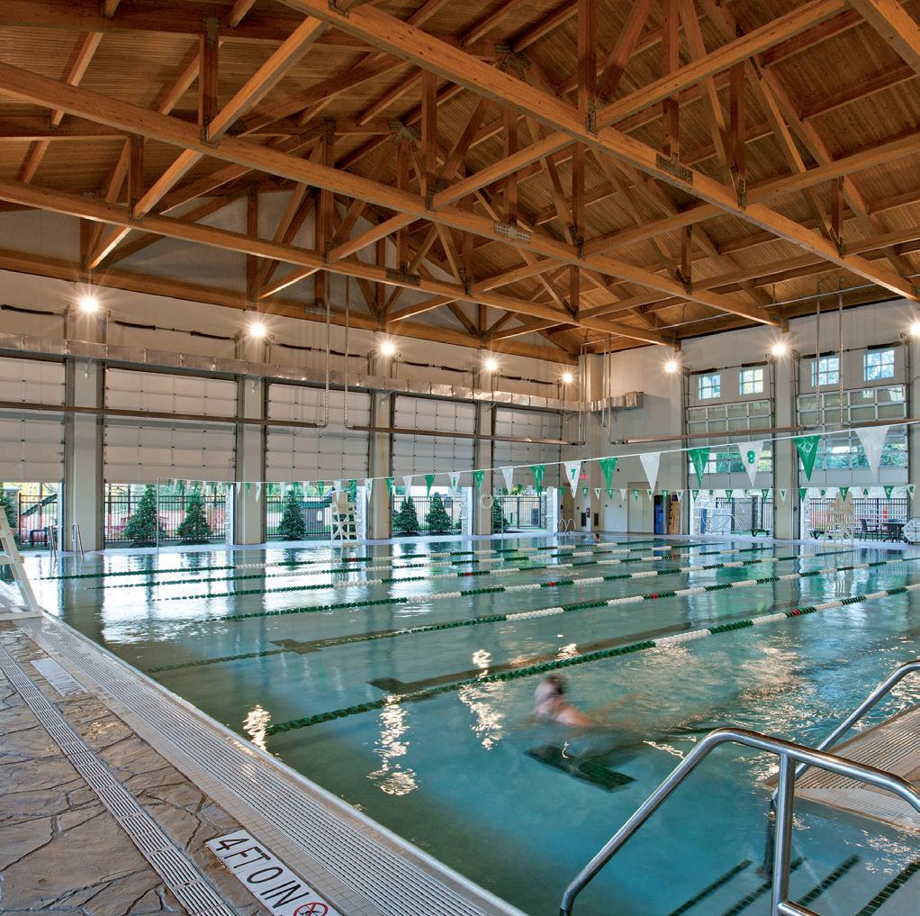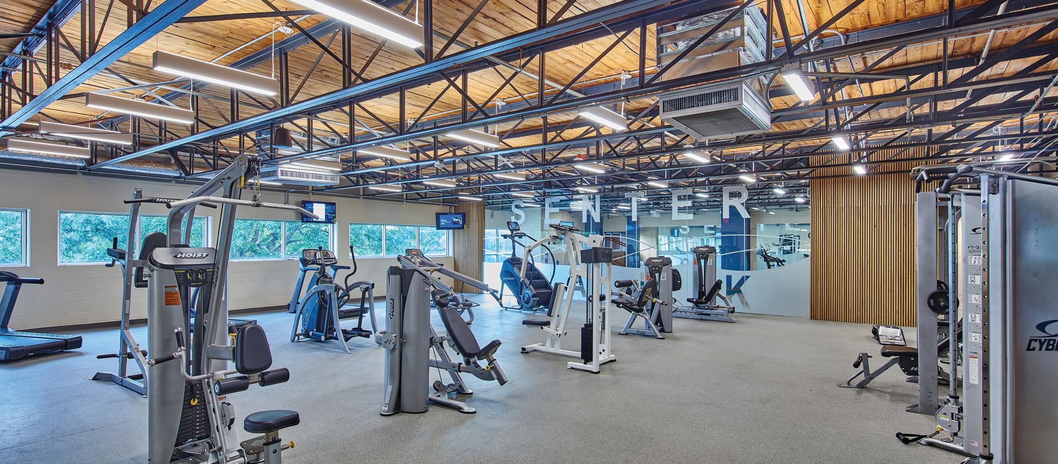 Fitness equipment and the weight room were relocated upstairs to maximize space and take advantage of abundant natural light. PGAL exposed the existing ceiling to highlight the natural wood finishes and structural trusses, reinforcing an open, modern feel. A transparent
