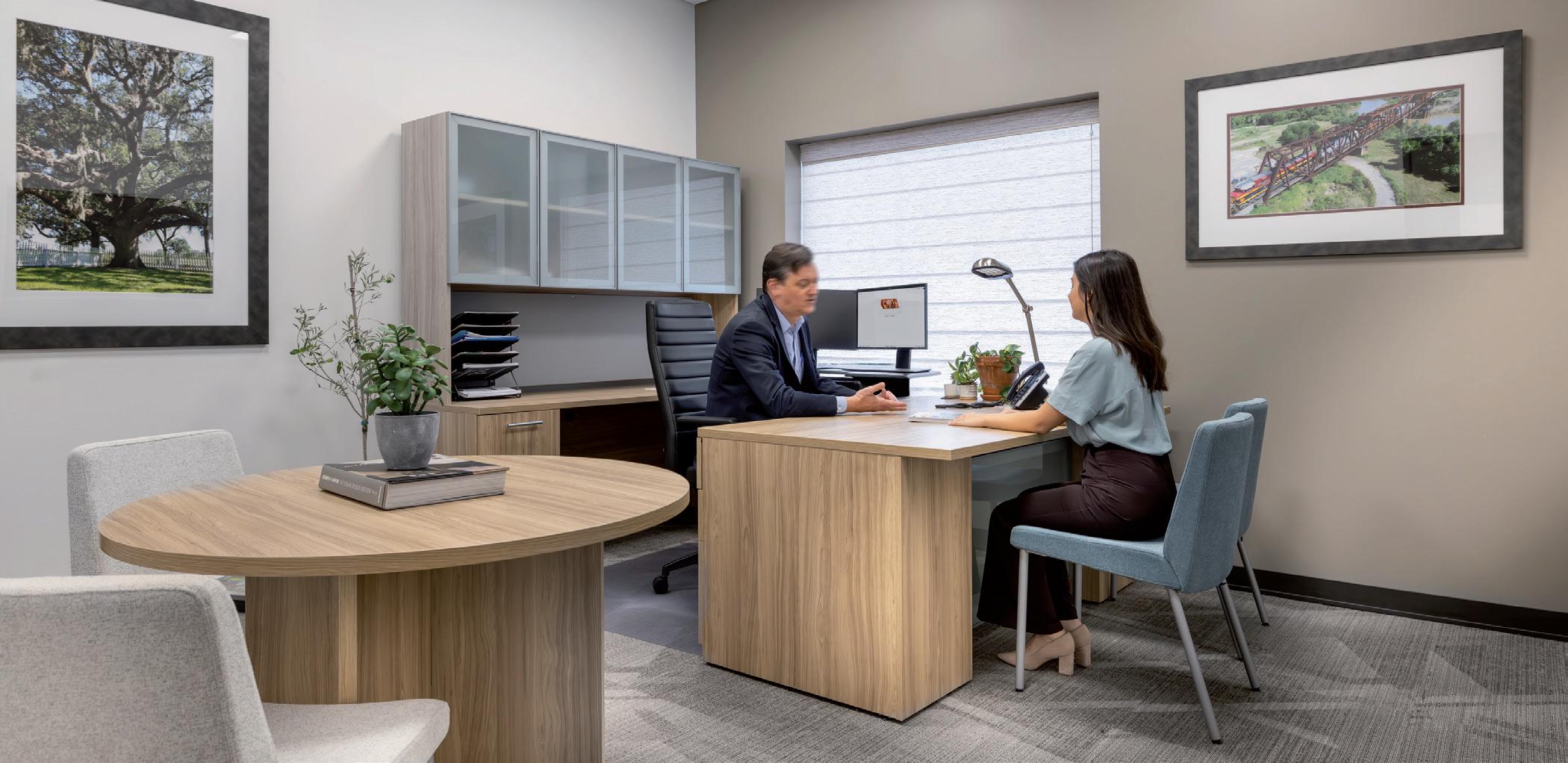 To support staff transitioning from private offices to systems furniture, PGAL developed workstation standards based on departmental hierarchy. Full-height, floor-to-ceiling wall systems provide necessary privacy while maintaining openness. Neutral tones in finishes are complemented by vibrant fabrics and furnishings, balancing professionalism with approachability.
