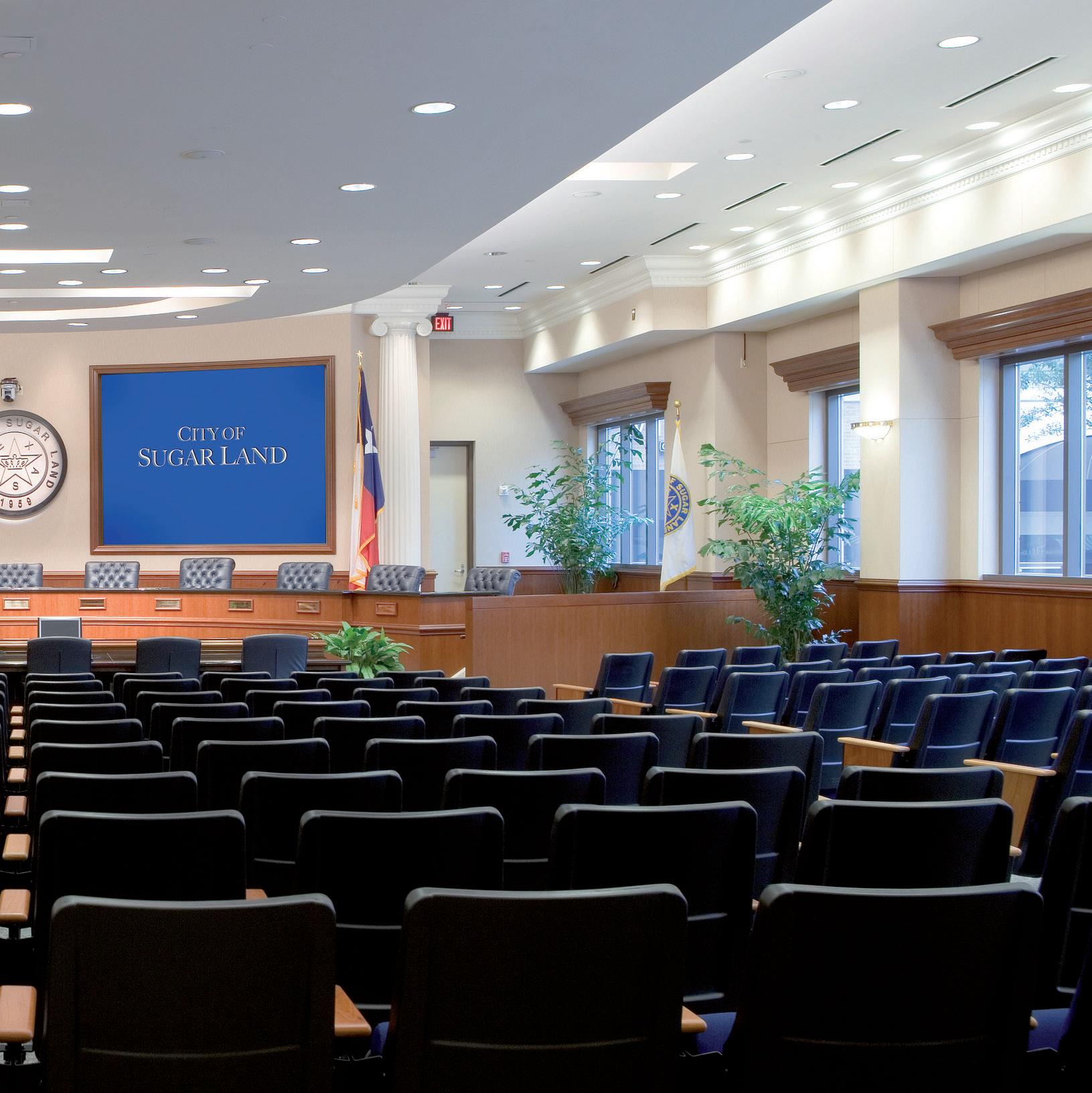 PGAL collaborated with the City of Sugar Land to design an iconic 81,000-square-foot, three-story City Hall that embodies the city's identity and growth. The building features a stately limestone and brick façade, a column-lined stair entry, and a copper bell and clock tower, creating a landmark presence. A central plaza accommodates community events and concerts, reinforcing civic engagement.