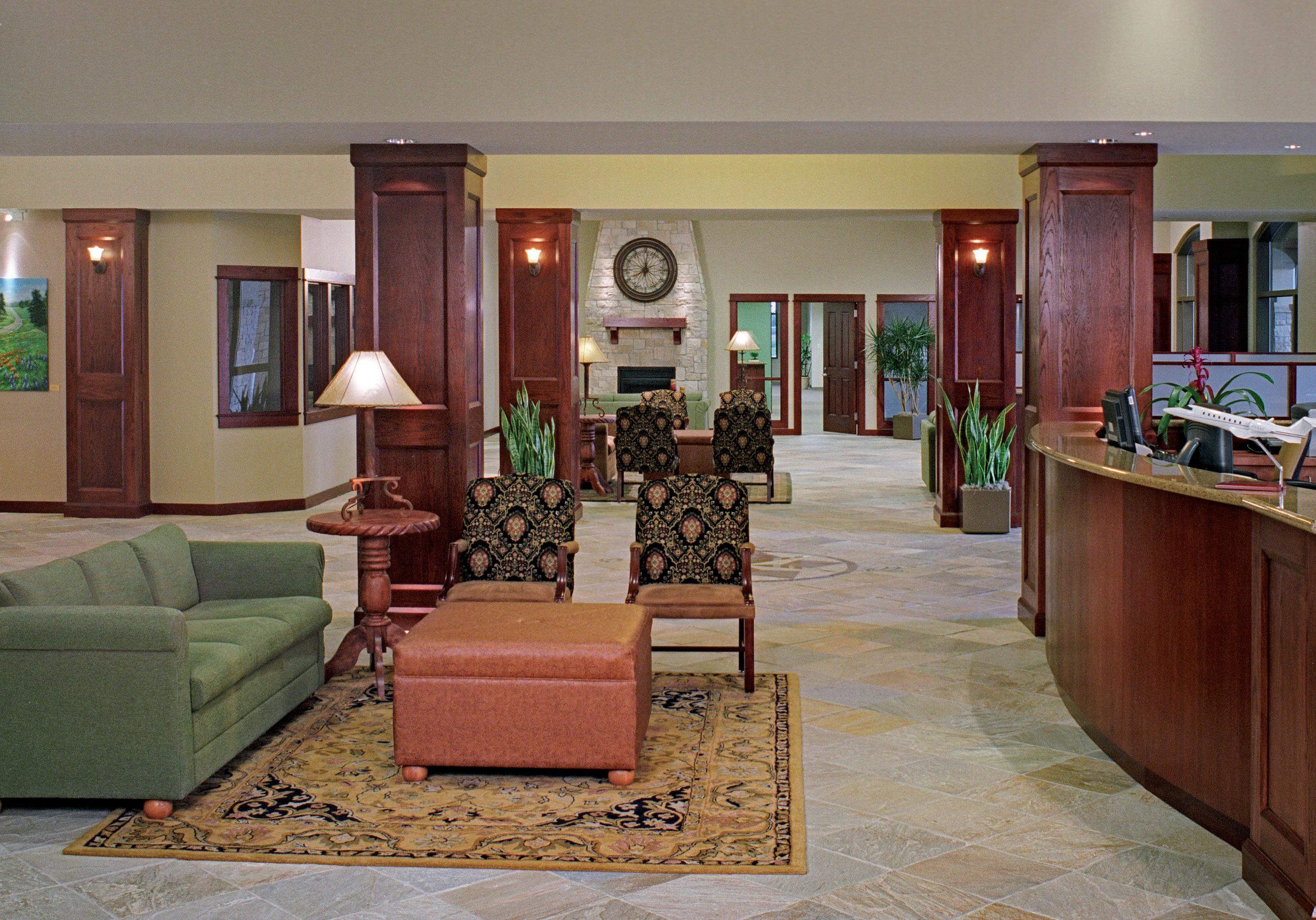 Texas limestone extends into the interior with two stone fireplaces in the lobby, while wood trusses add dimension and support to the building’s center spine.