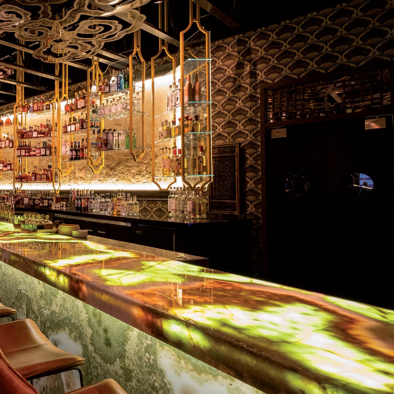 The project design features custom millwork and furniture, a back-lit onyx bar, graphic-printed plywood panels, and mirrored ceiling and wall-planes to name a few.