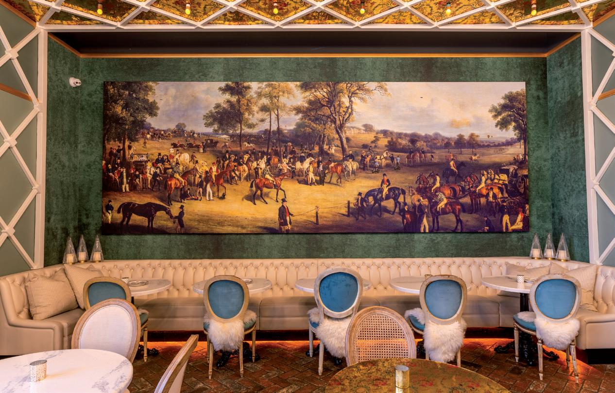 The design concept was inspired by a Louisiana carnival and features restored carousel elements such as dancing horse figurines, funhouse mirrors, faux French-inspired graphic murals, and a fully restored authentic carousel converted to a rotating bar that does a complete 360 degree revolution every 15 minutes.