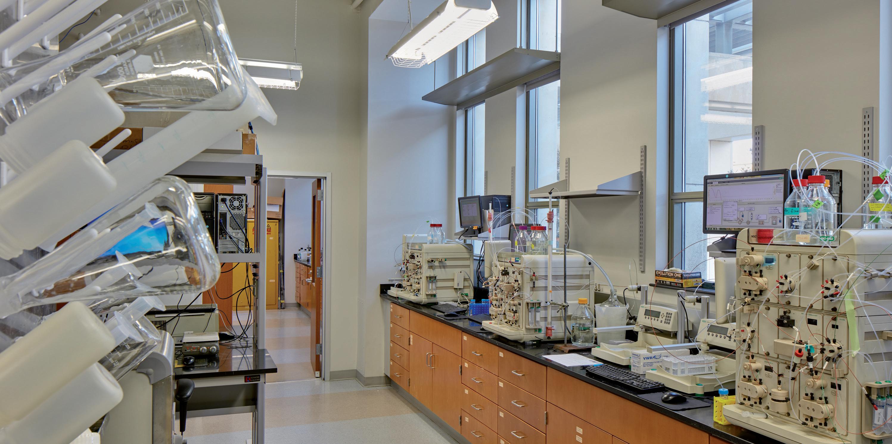 The design includes combination safety shower/ eyewashes, adequate aisle widths, adequate workspace at the bench and in fume hoods, and appropriate storage for all types of chemicals and instrumentation.