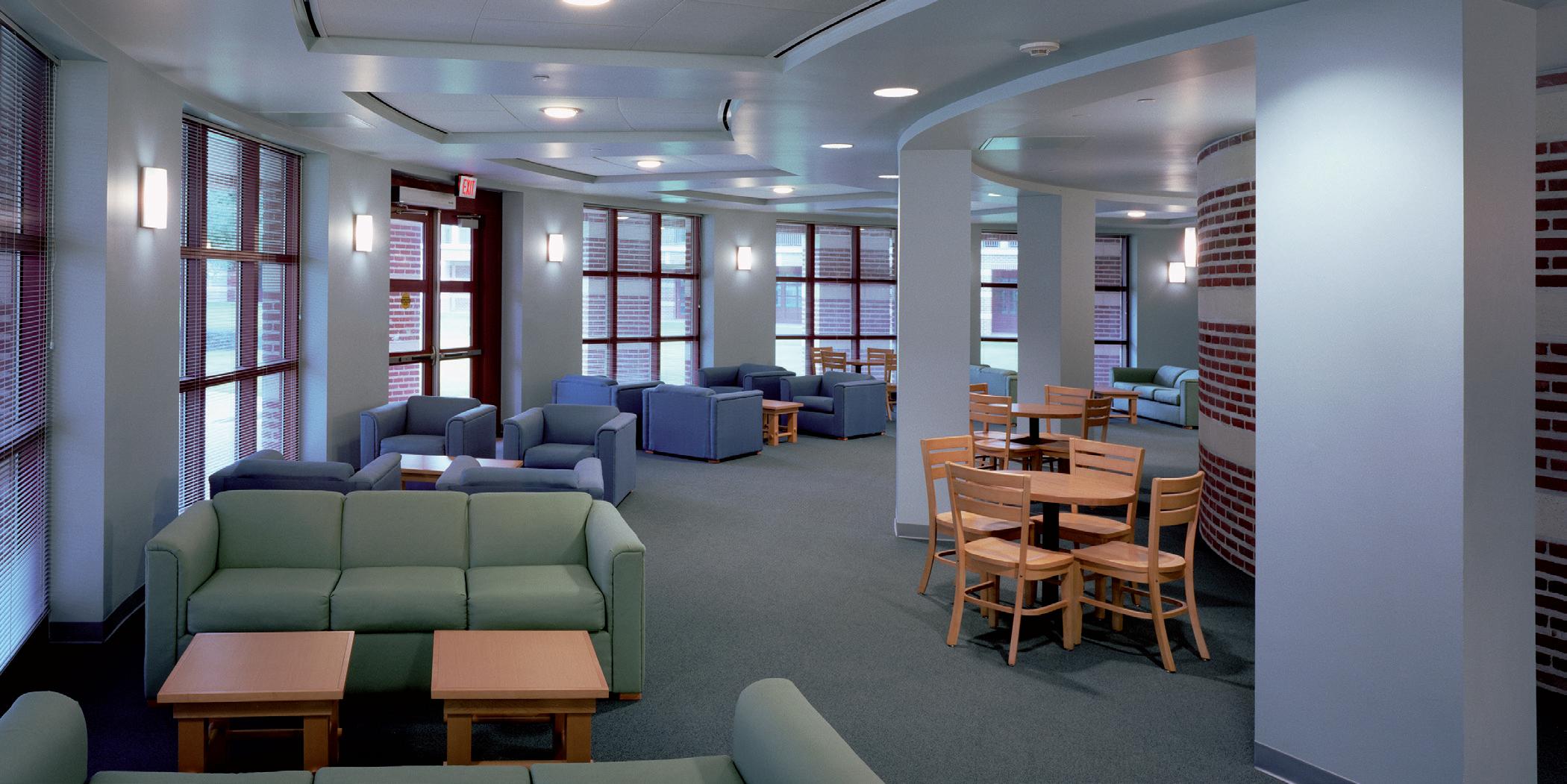a kitchenette and living room. Additional features include a 1,200-square-foot faculty apartment, 800-square-foot director’s apartment, learning center with media capabilities for special events, and gallery and gathering space adjacent to the learning center. Residents can also utilize the TV room, game room, computer lab, study rooms, and sound-isolated music practice rooms.