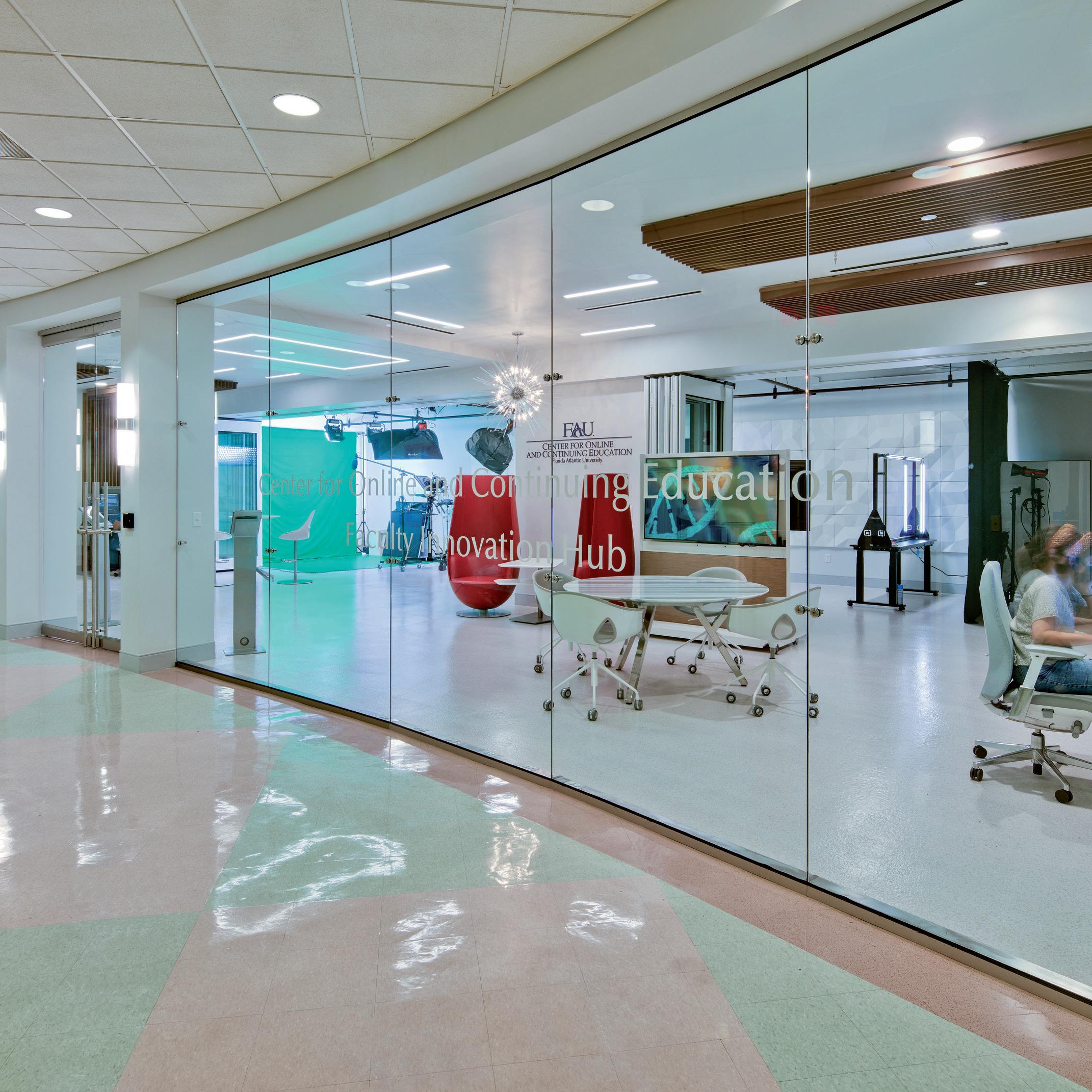 This suite within the Liberal Arts Building on the Davie Campus, was renovated to create an open space with an acoustical glass wall divider. On the back side of the space, a video recording studio was created with an open ceiling, a pipe grid for special lighting, a green wall and acoustical treatments for the walls and ceiling.