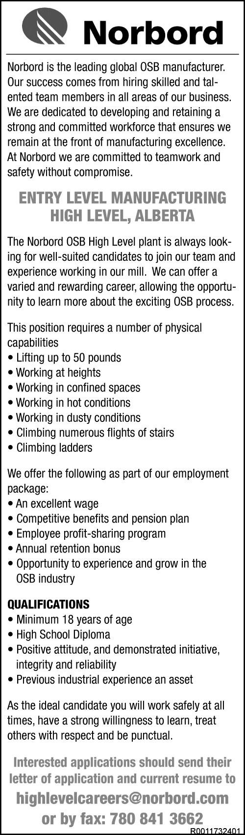 Lookingforajourneymanelectricianthathasworked aminimumofsevenyearsinasawmill.Theideal candidatewouldhaveaddedtechnicalcoursestohis resume,AdvancedPLCtraining,designingand workingwithAllenBradleyforcorrectiveand preventivemaintenance.Excellenthourlyrateand benefits.Ourelectricaldepartmenthasrotatingday andnightshifts.Wemanufacturedimensional lumber. 780-849-3824 laura@vanderwell.com www.vanderwell.com