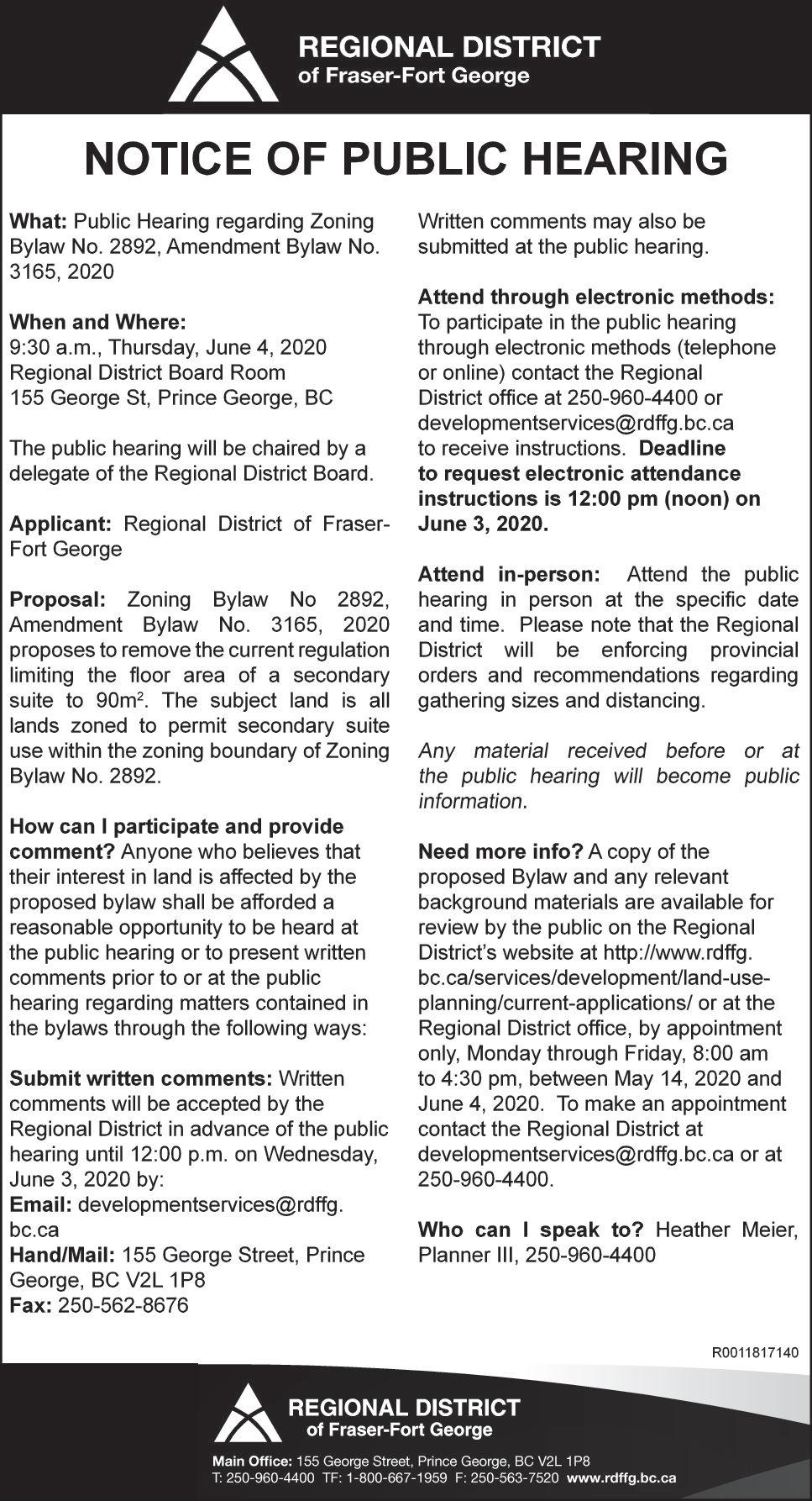 Be advised that any response to this advertisement will be considered part of the public record. For information, contact the Freedom of Information Advisor at FLNRORDs’ office in Omineca Region of British Columbia.