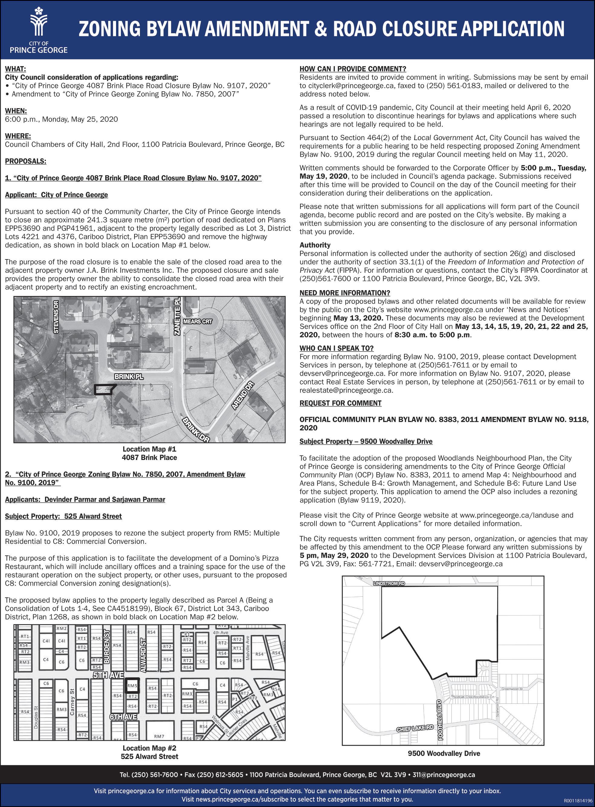 FLNRORD invites comments on this application, the Lands File is 7402906 Written comments concerning this application should be directed to Tricia Klein Land Officer, Omineca Region, FLNRORD, at 5th Floor 499George Street, Prince George, BC V2L 1R5 or Tricia.Klein@gov.bc.ca Comments will be received by FLNRORD up to June 19, 2020. FLNRORD may not be able to consider comments received after this date.