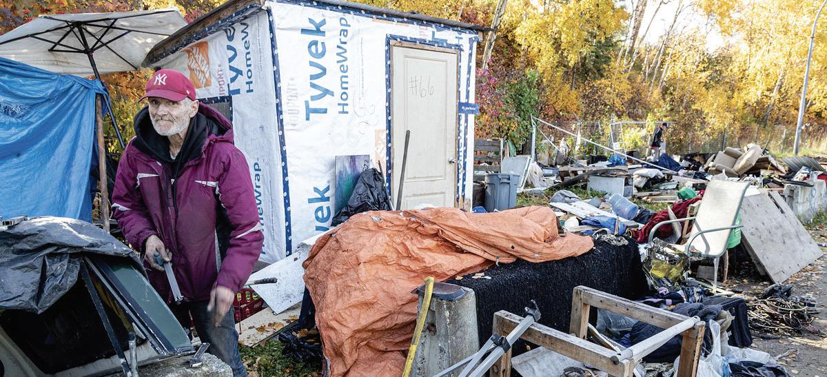Lawrence Lychak started living in the Moccasin Flats encampment after the basement suite he rented on Quince Street burned in a fire he had no part of. Lychak is one of an estimated 14 residents left in the encampment along Lower Patricia Boulevard in downtown Prince George.