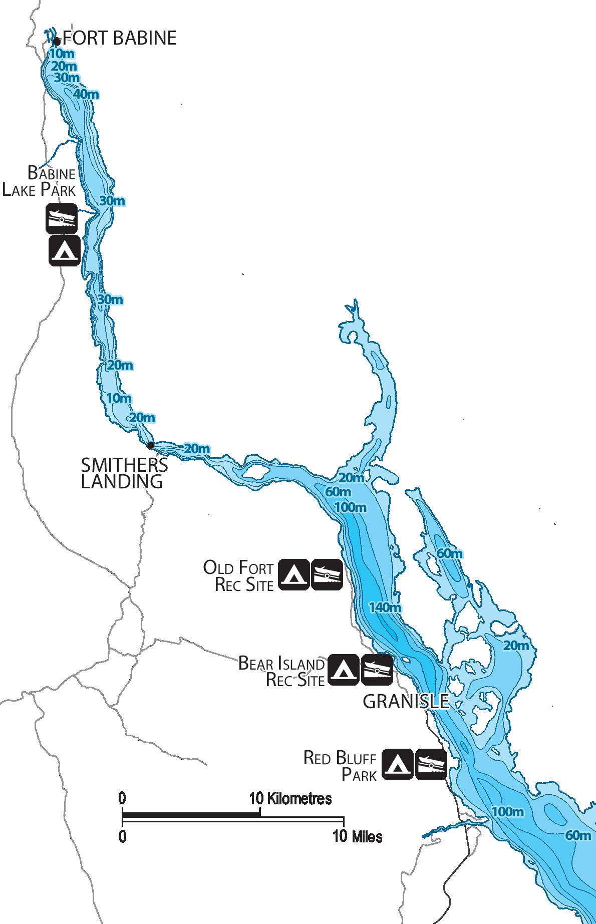 There are four primary access points to Babine Lake— north of Burns Lake to Pendelton Bay Provincial Park; near Granisle at recreation sites and provincial parks; at Smithers Landing and at Fort Babine. Granisle is located north of Topley (on Highway 16), following the
