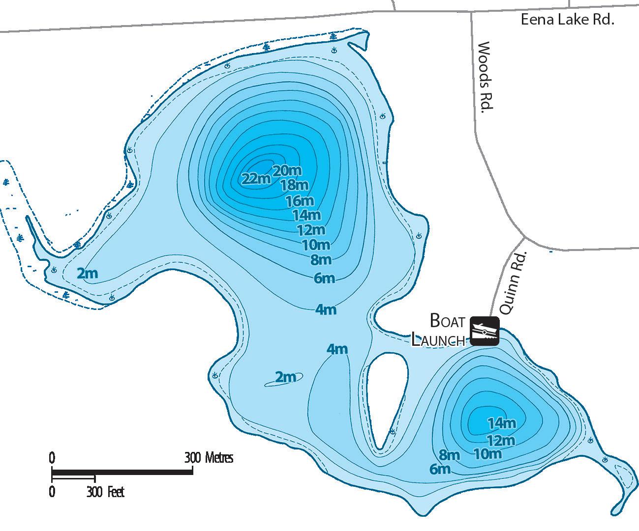 Eena Lake is located about 35 km north west of Prince George, near Nukko Lake. Follow Highway 97 north for about 15km to Chief Lake Rd, and turn left (west). Continue along Chief Lake Rd. for another 18km (Note: at the 13km mark the road forks - keep right at the fork). At Eena Lake Road turn left (west) and continue for 5 km. Make a left turn at Woods Road, and then right onto Quinn Rd. Access to the lake is at the end of the road.