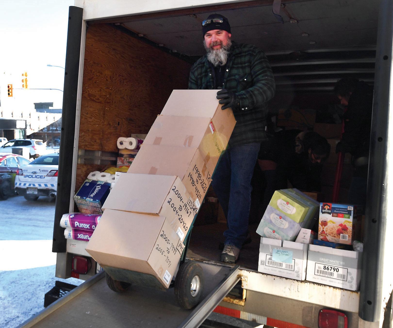 Tyler Fillion helps unload a cube van full of groceries collected by RCMP members during a Pack-A-Police-Car event in 2016. They will be back at it this Sunday at all four Save On Foods, 10 a.m. to 4 p.m.