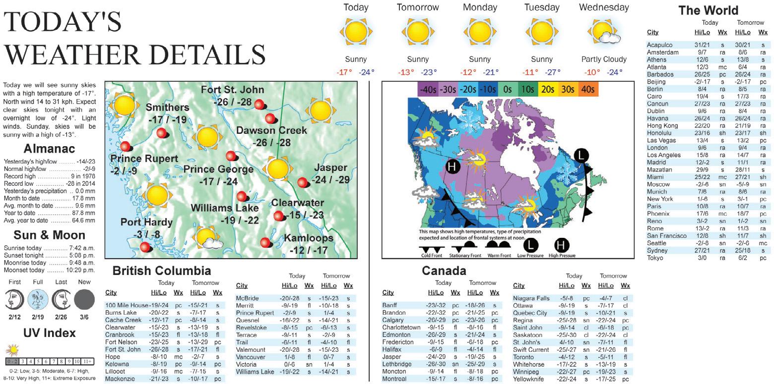 Environment Canada issued the warning early Friday morning in response to a cold arctic air mass has settling over the Central Interior. Add on the wind chill and you’ll want to bundle up. “The combination of cold temperatures and winds will produce wind chills of minus 40 overnight,” the agency said. “The wind chill values are expected to ease Saturday afternoon.”