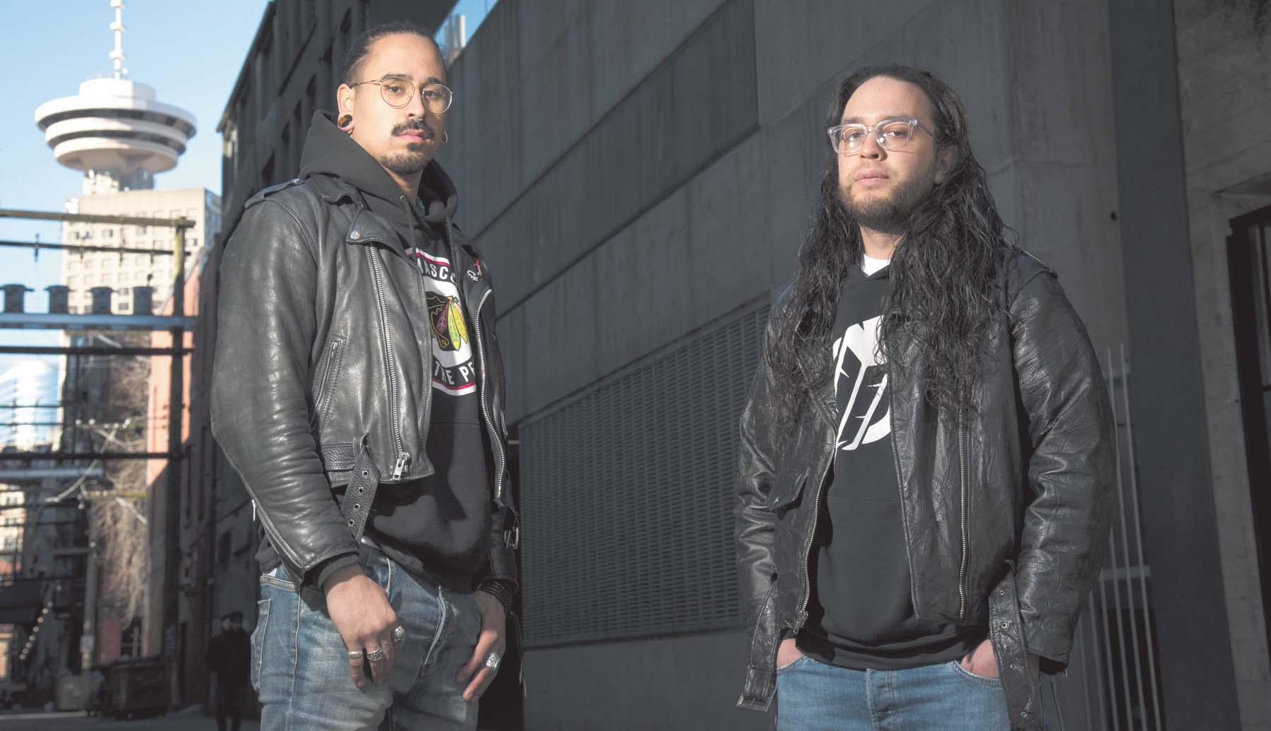 Quinton Nyce, left, and Darren Metz of Snotty Nose Rez Kids pose for a photo in downtown Vancovuer. The Average Savage, the Northern B.C. rap duo’s 2017 sophomore album is nominated at the Juno Awards in the Indigenous Music album category.