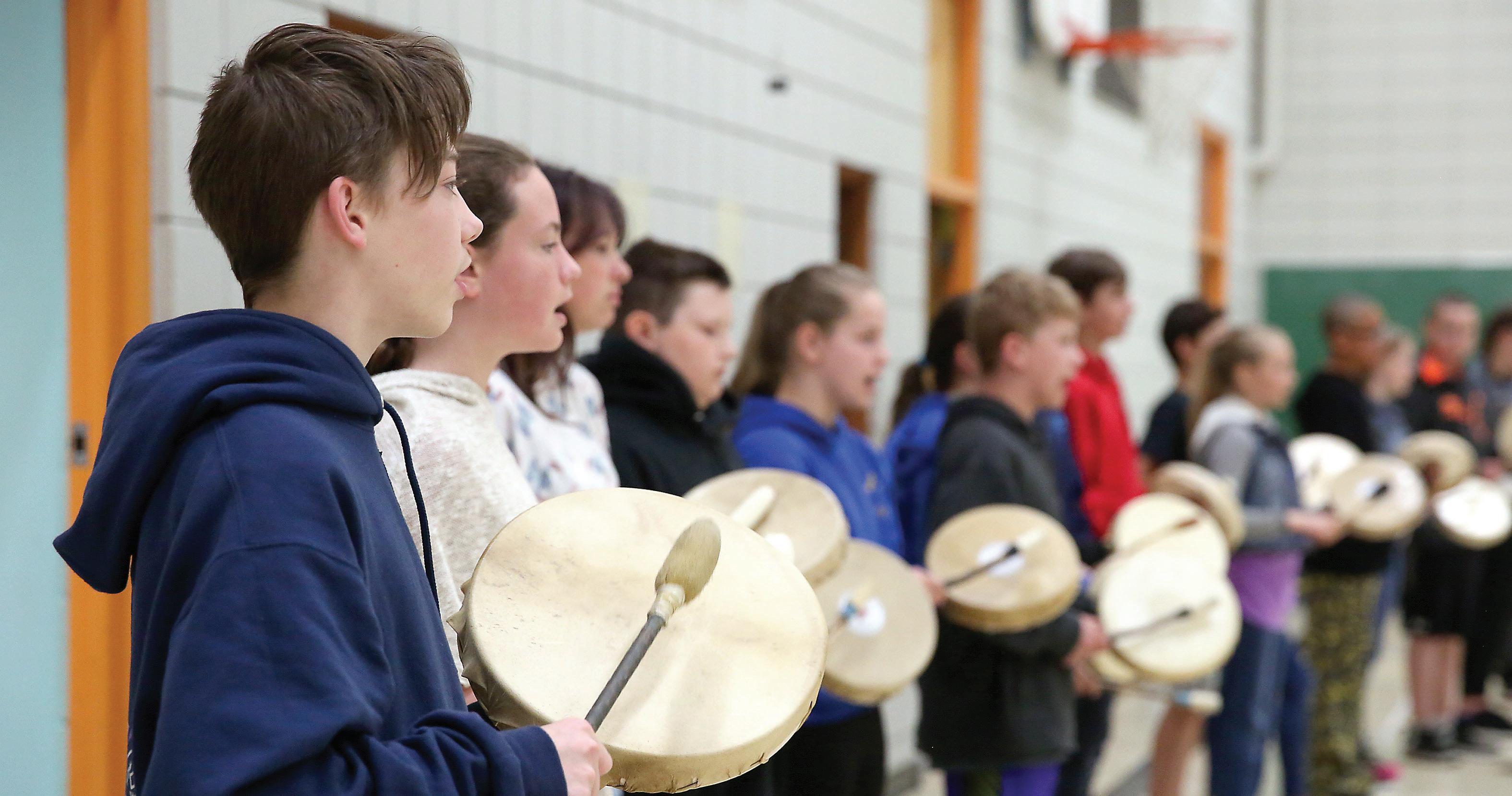 Students from the Division 6 class of Ms. O’Brien perform Francois Princes’s Dakelh K’Una at Buckhorn Elementary School on Tuesday morning. Students in the school spent the past few months learning drum protocols, and First Nations songs from across Canada.