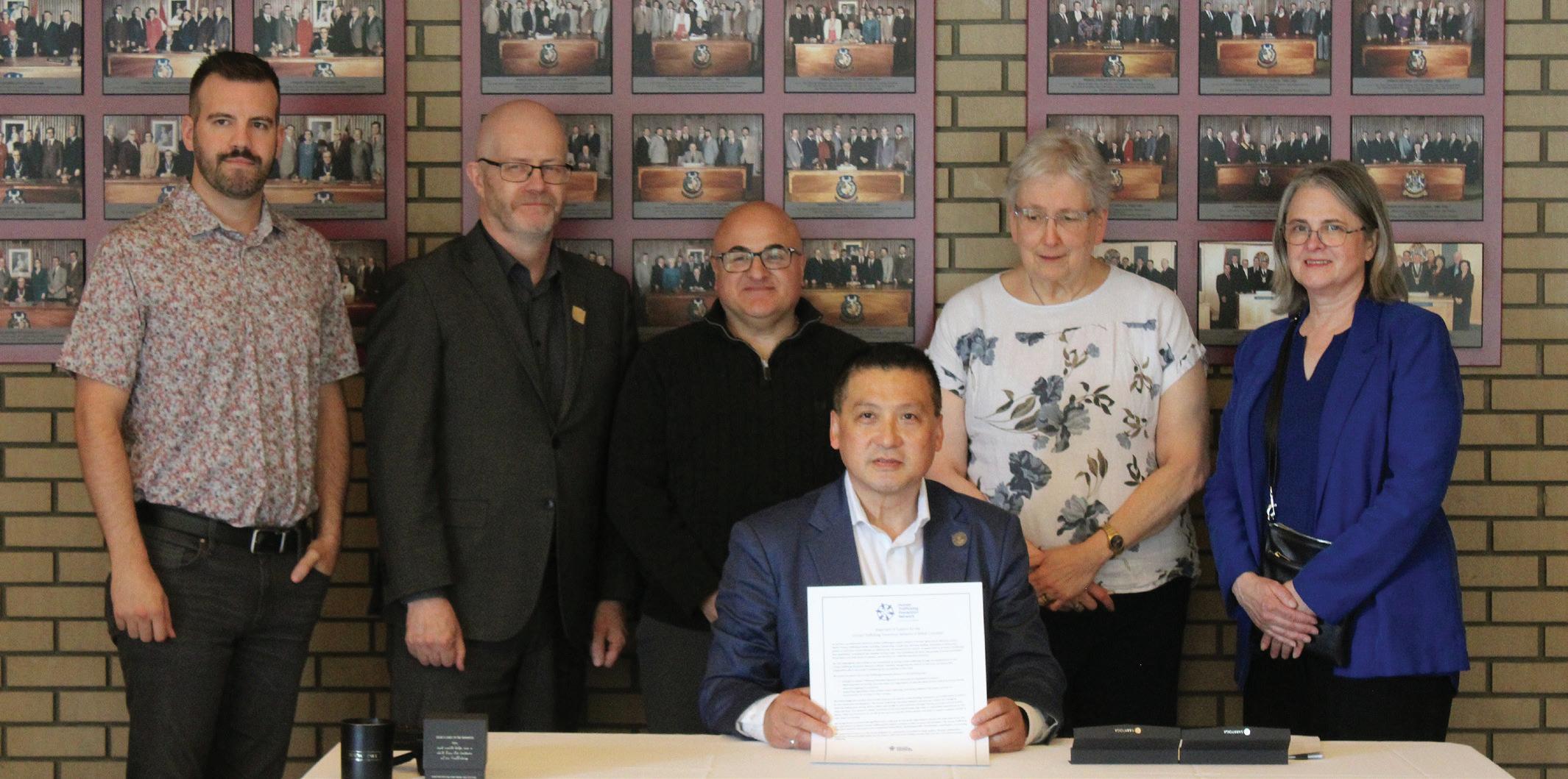 Mayor Simon Yu and councillors Garth Frizzell, Trudy Klassen, Ron Polillo, Kyle Sampson and Susan Scott signed a statement of support denouncing trafficking as a human rights violation and committing to work towards ending it.