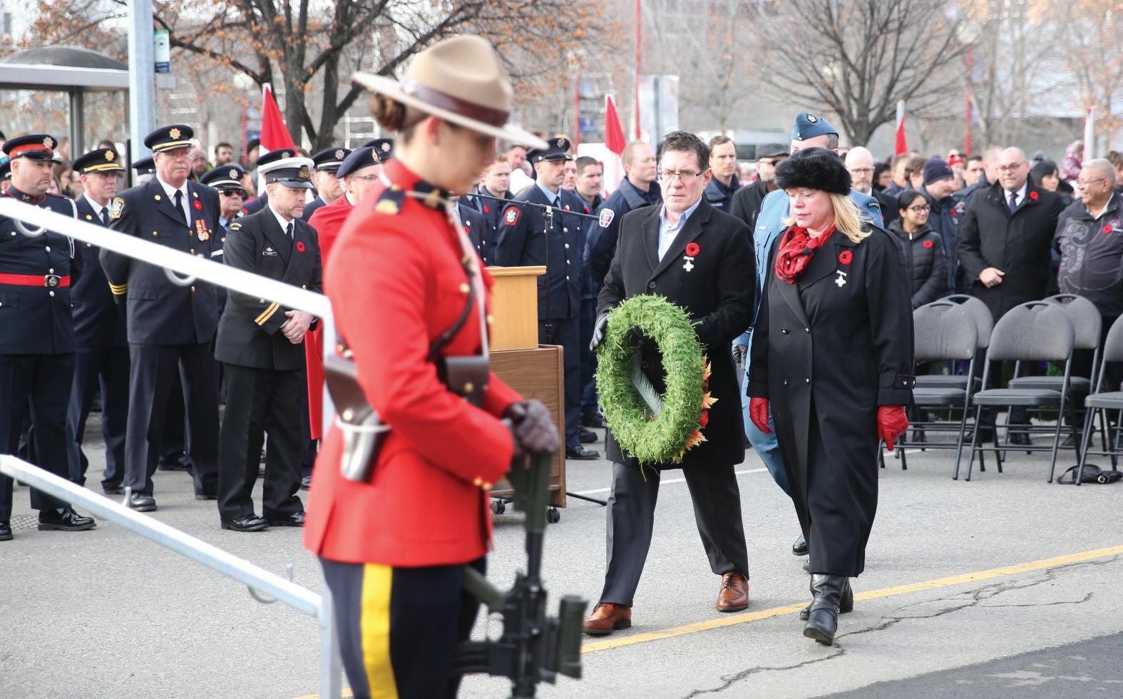 TOP: The Royal Canadian Legion Colour Party leads the Remembrance Day Parade down Canada Games Plaza on Sunday morning on its way to the temporary cenotaph on Seventh Avenue.