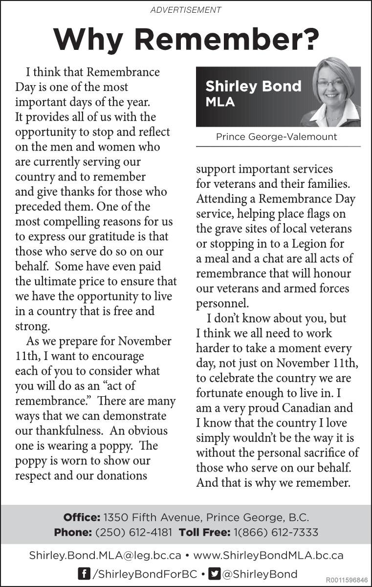 The annual Remembrance Day ceremony takes place Sunday at the Prince George Civic Centre beginning at 9:15 a.m.