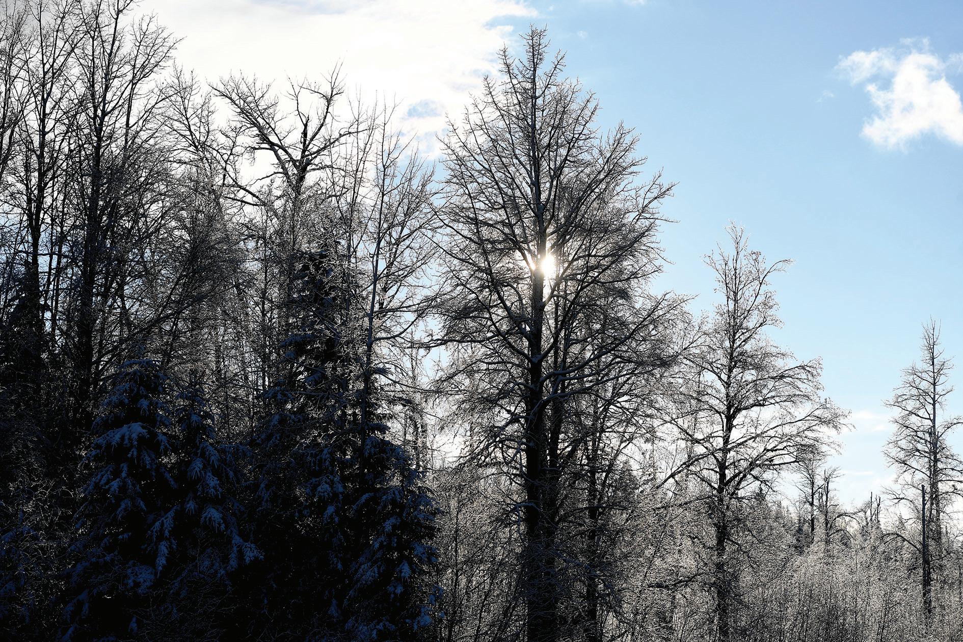 LEFT: The sun breaks through frost-covered trees along Highway 16.