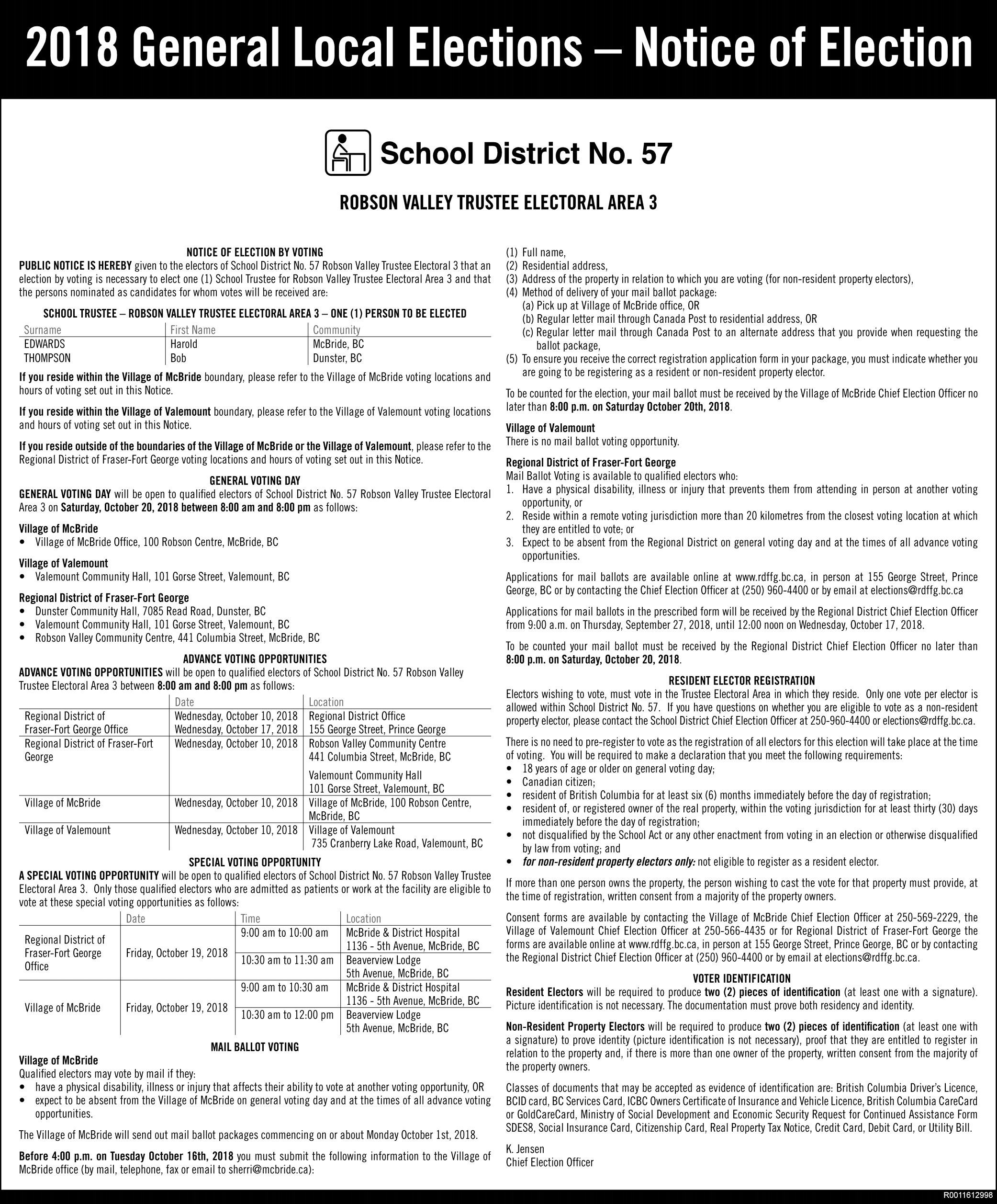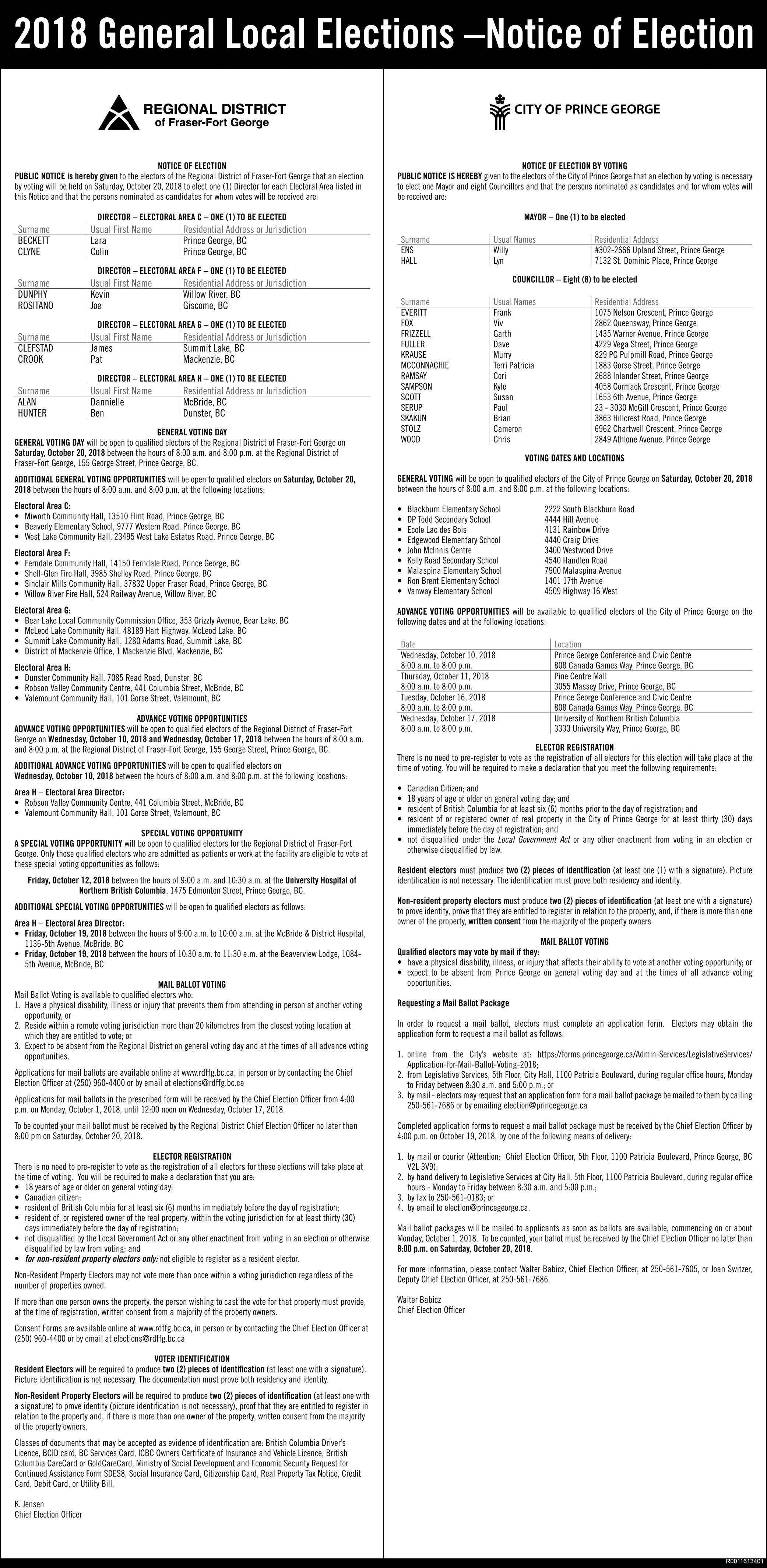 limit is 0.5 metres. Candidates remain free and clear to put up signs along Highways 16 and 97 – which includes First Avenue – because they are under provincial jurisdiction. A Ministry of Transportation and Infrastructure policy is much more wide open but does require that they not pose a traffic hazard, be posted on or obstruct a traffic control device and be further from the roadside than standard traffic signs. They are also prohibited from bridges, overpasses, tunnels or other highway structures.