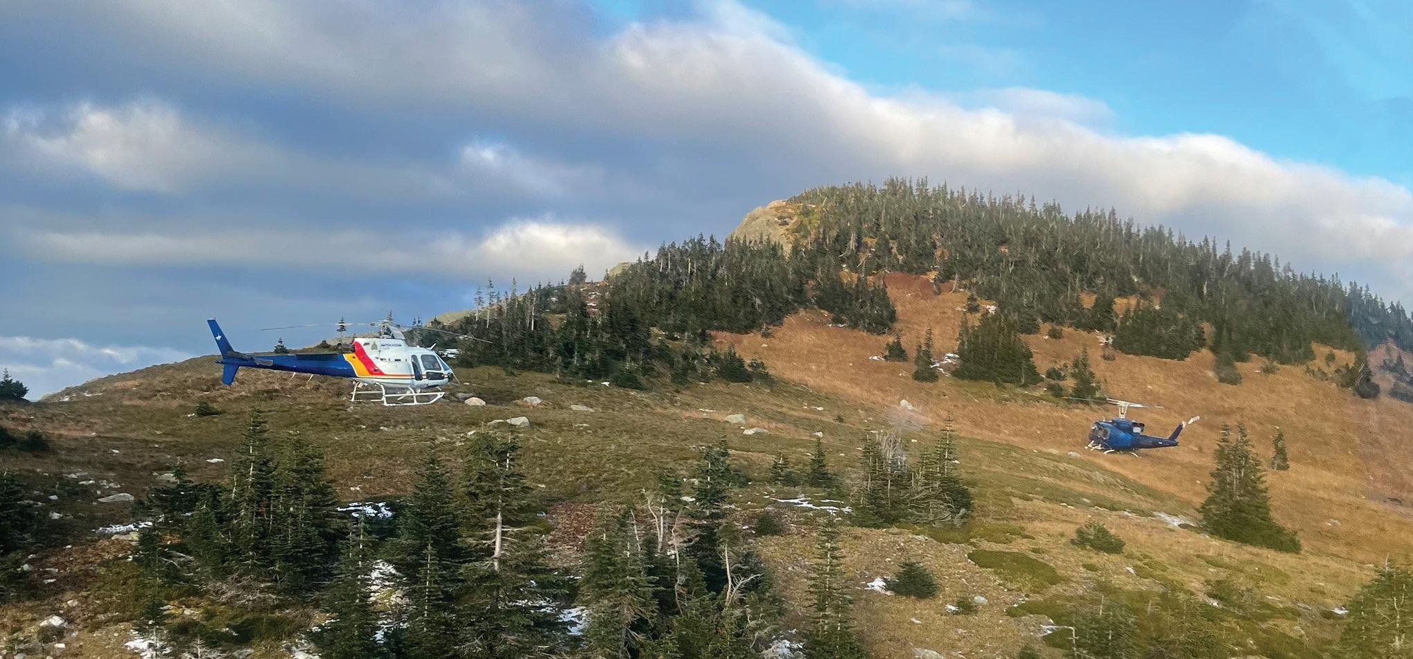 Helicopters land near McGregor Mountain after two hikers were reportedly attacked by a grizzly bear on Sunday, Oct. 12. Specialists were called to the scene to investigate, the BC Conservation Officer Service reports. In the meantime, trails in the area, which includes Pass Lake, were ordered closed.