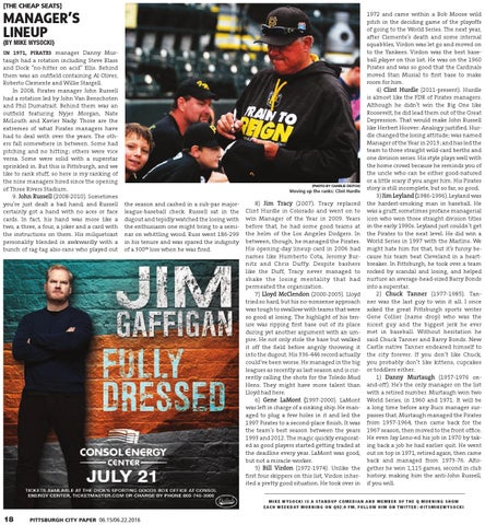 1972 and came within a Bob Moose wild pitch in the deciding game of the playoffs of going to the World Series. The next year, after Clemente’s death and some internal squabbles, Virdon was let go and moved on to the Yankees. Virdon was the best baseball player on this list. He was on the 1960 Pirates and was so good that the Cardinals moved Stan Musial to first base to make room for him. 4) Clint Hurdle (2011-present). Hurdle is almost like the FDR of Pirates managers. Although he didn’t win the Big One like Roosevelt, he did lead them out of the Great Depression. That would make John Russell like Herbert Hoover: Analogy justified. Hurdle changed the losing attitude; was named Manager of the Year in 2013; and has led the team to three straight wild-card berths and one division series. His style plays well with the home crowd because he reminds you of the uncle who can be either good-natured or a little scary if you anger him. His Pirates story is still incomplete, but so far, so good. 3) Jim Leyland (1986-1996). Leyland was the hardest-smoking man in baseball. He was a gruff, sometimes profane managerial icon who won three straight division titles in the early 1990s. Leyland just couldn’t get the Pirates to the next level. He did win a World Series in 1997 with the Marlins. We might hate him for that, but it’s funny because his team beat Cleveland in a heartbreaker. In Pittsburgh, he took over a team rocked by scandal and losing, and helped nurture an average-head-sized Barry Bonds into a superstar. 2) Chuck Tanner (1977-1985). Tanner was the last guy to win it all. I once asked the great Pittsburgh sports writer Gene Collier (name drop) who was the nicest guy and the biggest jerk he ever met in baseball. Without hesitation he said Chuck Tanner and Barry Bonds. New Castle native Tanner endeared himself to the city forever. If you don’t like Chuck, you probably don’t like kittens, cupcakes or toddlers either. 1) Danny Murtaugh (1957-1976 onand-off). He’s the only manager on the list with a retired number. Murtaugh won two World Series, in 1960 and 1971. It will be a long time before any Bucs manager surpasses that. Murtaugh managed the Pirates from 1957-1964, then came back for the 1967 season, then moved to the front office. He even Jay Leno-ed his job in 1970 by taking back a job he had earlier quit. He went out on top in 1971, retired again, then came back and managed from 1973-76. Altogether he won 1,115 games, second in club history, making him the anti-John Russell, if you will.