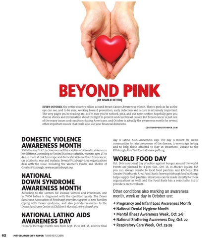 EVERY OCTOBER, the entire country rallies around Breast Cancer Awareness month. There’s pink as far as the eye can see, and to be sure, working toward prevention, early detection and a cure is extremely important. The very pages you’re reading are, as I’m sure you’ve noticed, pink, and our news section hopefully gave you diverse stories and information about the fight to prevent and cure breast cancer. But breast cancer is just one of the many issues and conditions facing Americans, and October is actually the awareness month for several other important causes that could also use your financial donations. C DE IT C H @PGH C IT YPA P E R. C OM