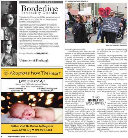 Scott says. “Black femmes have been doing the foundation of this work and will continue to.” But this is not your grandmother’s civilrights movement. The organizers are bold and unapologetic. And some have even called them hostile. At one point during the march in East Liberty, Murphy-Green turned her megaphone on a group of marchers to reprimand them. They had been shouting, “No Trump, no KKK, no racist USA.” “This isn’t about Trump,” MurphyGreen shouted. And when chanting died down at one point, Murphy said, “You all have no problem being loud when it’s about Trump.” “Marchers were screaming ‘pussy grabs back’ and ‘Eff Donald Trump’ and all that extra shit, and we had made it very, very clear that this was not an anti-Trump space,” Murphy-Green says. “So for people to not do their research, come to an event and get upset when you put them in line, it doesn’t make sense. “People were equating womanhood with vaginas and not even realizing how harmful and hurtful that is to non-binary folks. Allies who came had to really check themselves the entire time.” Context is important, the organizers say. Instead of labeling the East Liberty march organizers as mean, hostile or aggressive, they’re asking people to look at the message of inclusivity they’re sending, and they’re asking white feminist allies to be more introspective about their unconscious biases against people of color and the LGBT community. “The angry-black-woman narrative