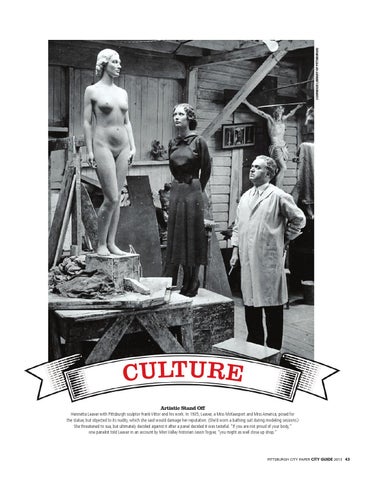 CULTURE Artistic Stand Off Henrietta Leaver with Pittsburgh sculptor Frank Vittor and his work. In 1935, Leaver, a Miss McKeesport and Miss America, posed for the statue, but objected to its nudity, which she said would damage her reputation. (She’d worn a bathing suit during modeling sessions.) She threatened to sue, but ultimately decided against it after a panel decided it was tasteful. “If you are not proud of your body,” one panelist told Leaver in an account by Mon Valley historian Jason Togyer, “you might as well close up shop.”