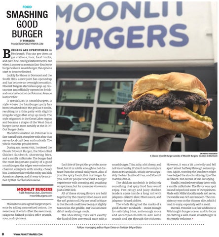 URGERS ARE EVERYWHERE in Pittsburgh. You can get them at gas stations, bars, food trucks, and even fine-dining establishments. But when it comes to a certain fast-food style burger called a smashburger, the options start to become limited. Luckily for those in Dormont and the South Hills, a new joint has opened up and has become an overnight sensation. Moonlit Burgers started as a pop-up restaurant and officially opened its brickand-mortar location on Potomac Avenue last October. It specializes in smashburgers, a style where the hamburger patty has been smashed onto the grill as it cooks, resulting in a thin patty with slightly irregular edges that crisp up nicely. The style originated in the Great Lakes region and became a staple of the West Coast burger scene, most notably at the In-NOut Burger chain. Moonlit’s location on Potomac is a fast-casual joint, complete with a bar that serves local craft beer and cocktails. The vibe is modern, yet a bit retro. During my recent visit, I ordered the Classic Moonlit Burger, the Moon Bird Chicken Sandwich, shoestring fries, and a vanilla milkshake. The burger had the most important quality of a good smashburger: the edges were extremely charred, complete with smoky, chewy bits. Combine this with the melty and rich American cheese, and it’s easy to be satisfied by that combination alone.