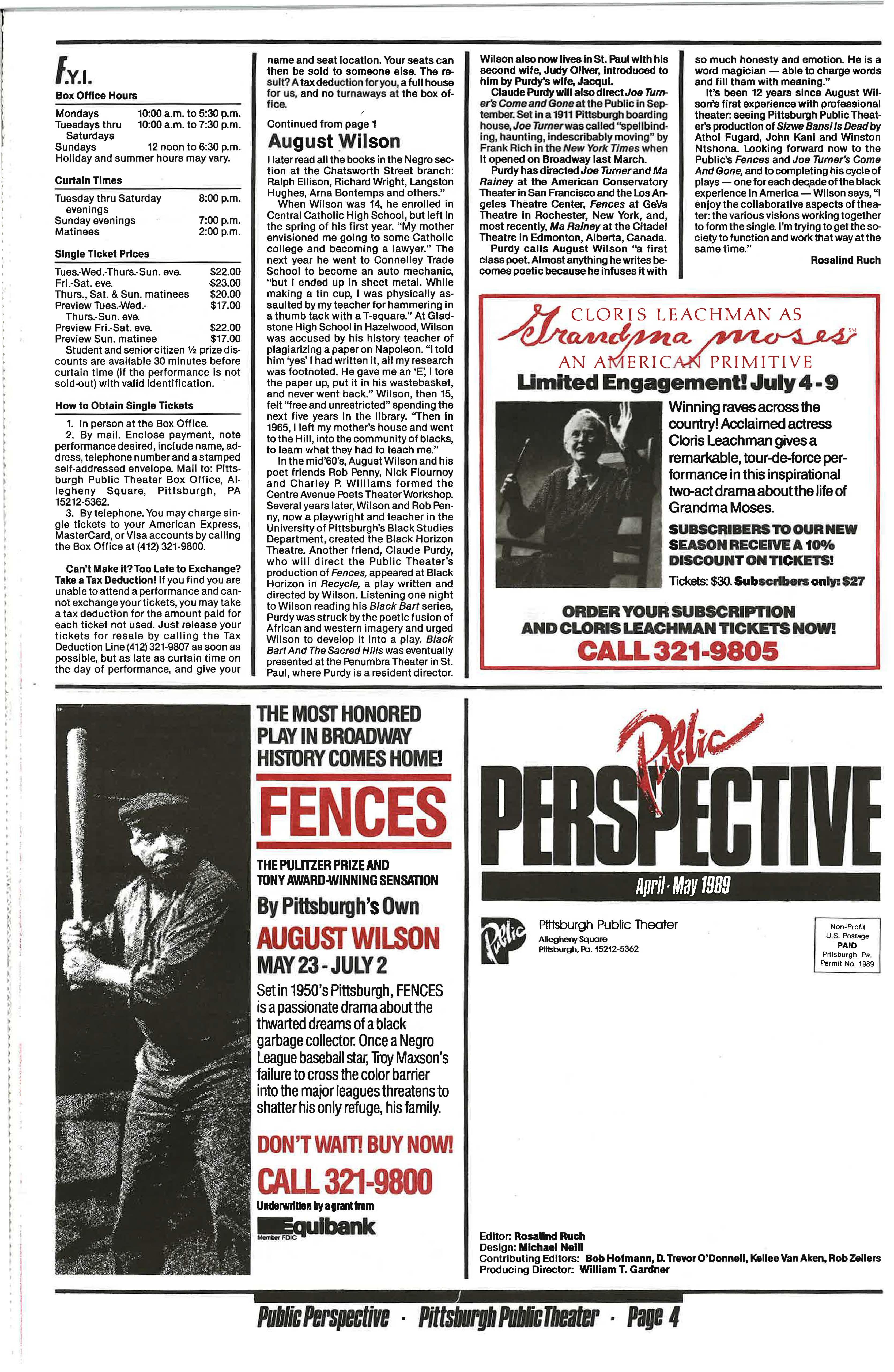 In 1987, August Wilson's play Fences, which will have its Pittsburgh premiere at the Public Theater on May 23, won the Pulitzer Prize, four Tony Awards, including Best Drama, and virtually every award a playwright can receive.