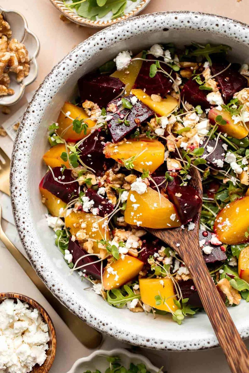 Arrange the arugula, microgreens, beets, walnuts, and feta cheese in a large serving bowl Drizzle with the vinaigrette dressing and toss well Serve immediately