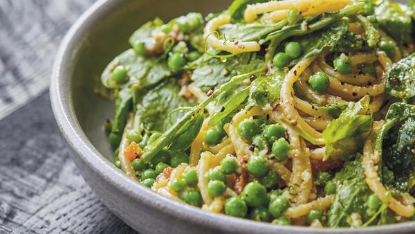 Fill a large saucepan with boiling water from the kettle, season well with salt and bring to the boil on the hob, then cook the spaghetti for 10 mins until al dente Add the asparagus and broccoli for the final 3 mins of cooking time, and the peas for the final 30 seconds