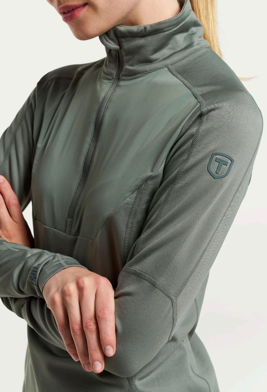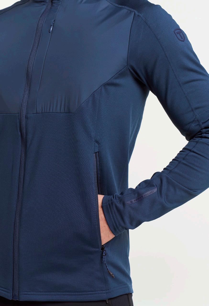 Jakken er laget av Tensons hurtigtørkende, myke og fleksible Power Comfort-materiale, pluss et lett vindblokkende stoff på øvre del av brystet som holder deg varm når det blåser.