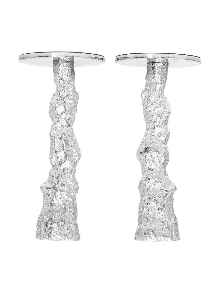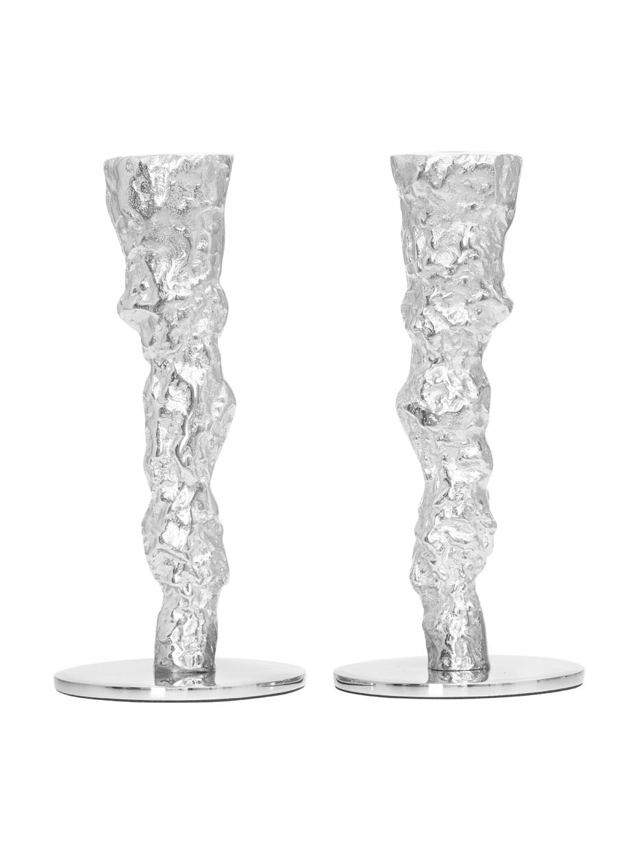 To lysestaker med stilrent, tvunnet design i aluminium med ståldetaljer. Dette gir dem et sofistikert og moderne uttrykk. De er ideelle for å gi interiøret ditt et stilig preg og skape en varm og innbydende atmosfære.