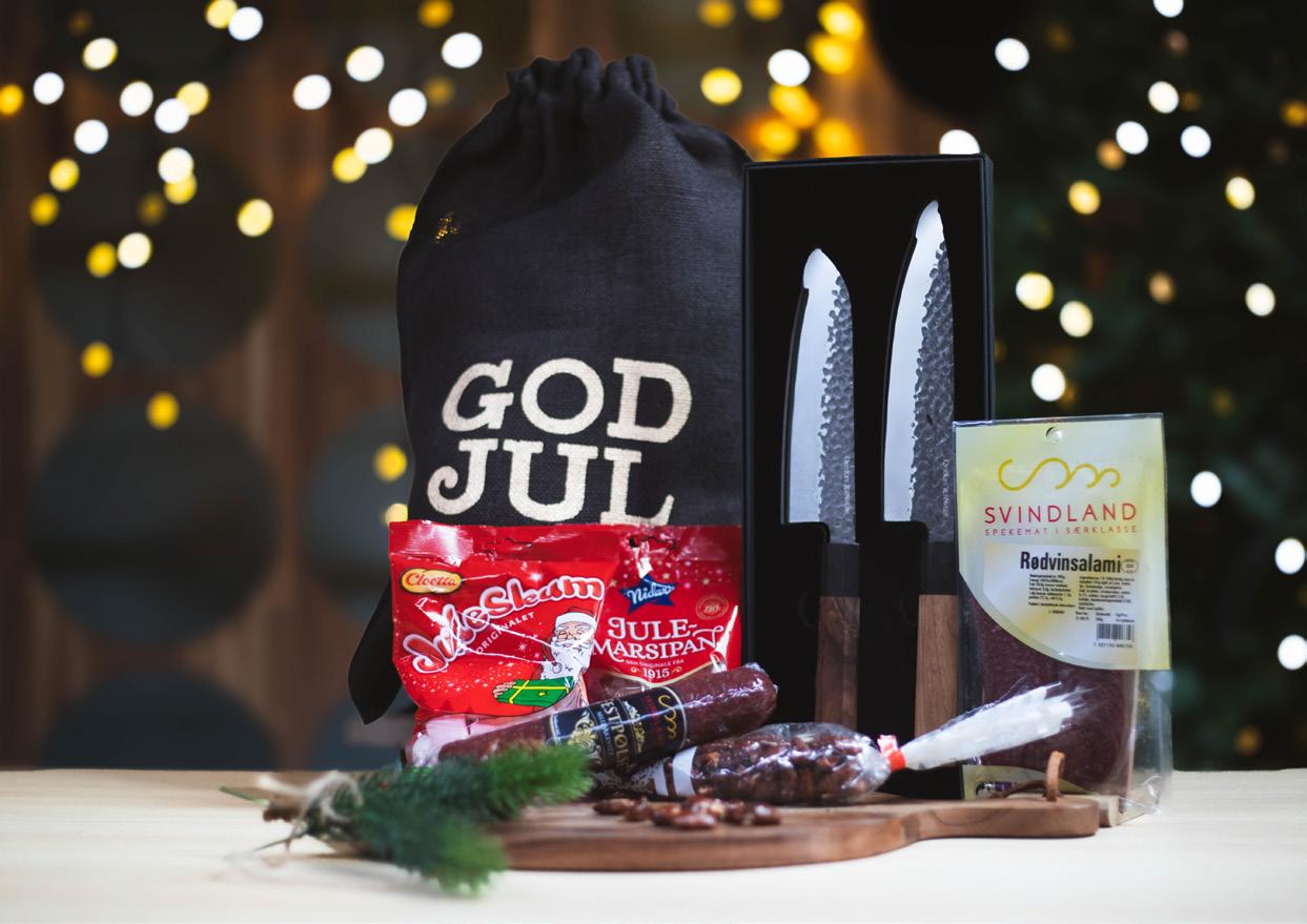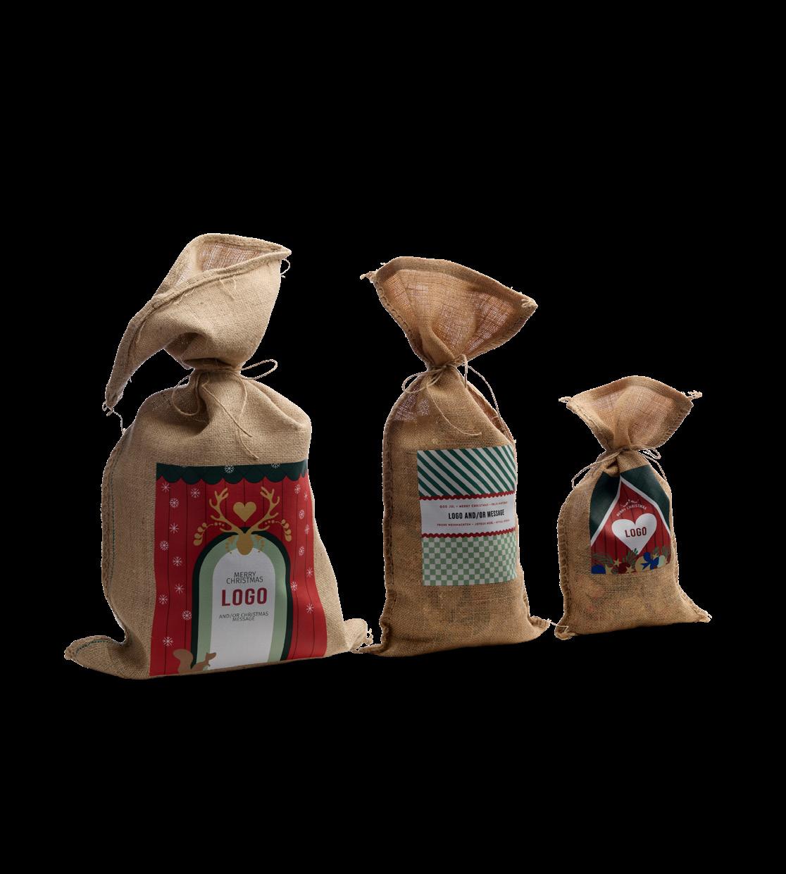 Luksuriøst innhold levert i en fin julesekk av jute. Velg ditt motiv med trykk på posen eller etiketten, og legg ved en personlig julehilsen (inkludert).