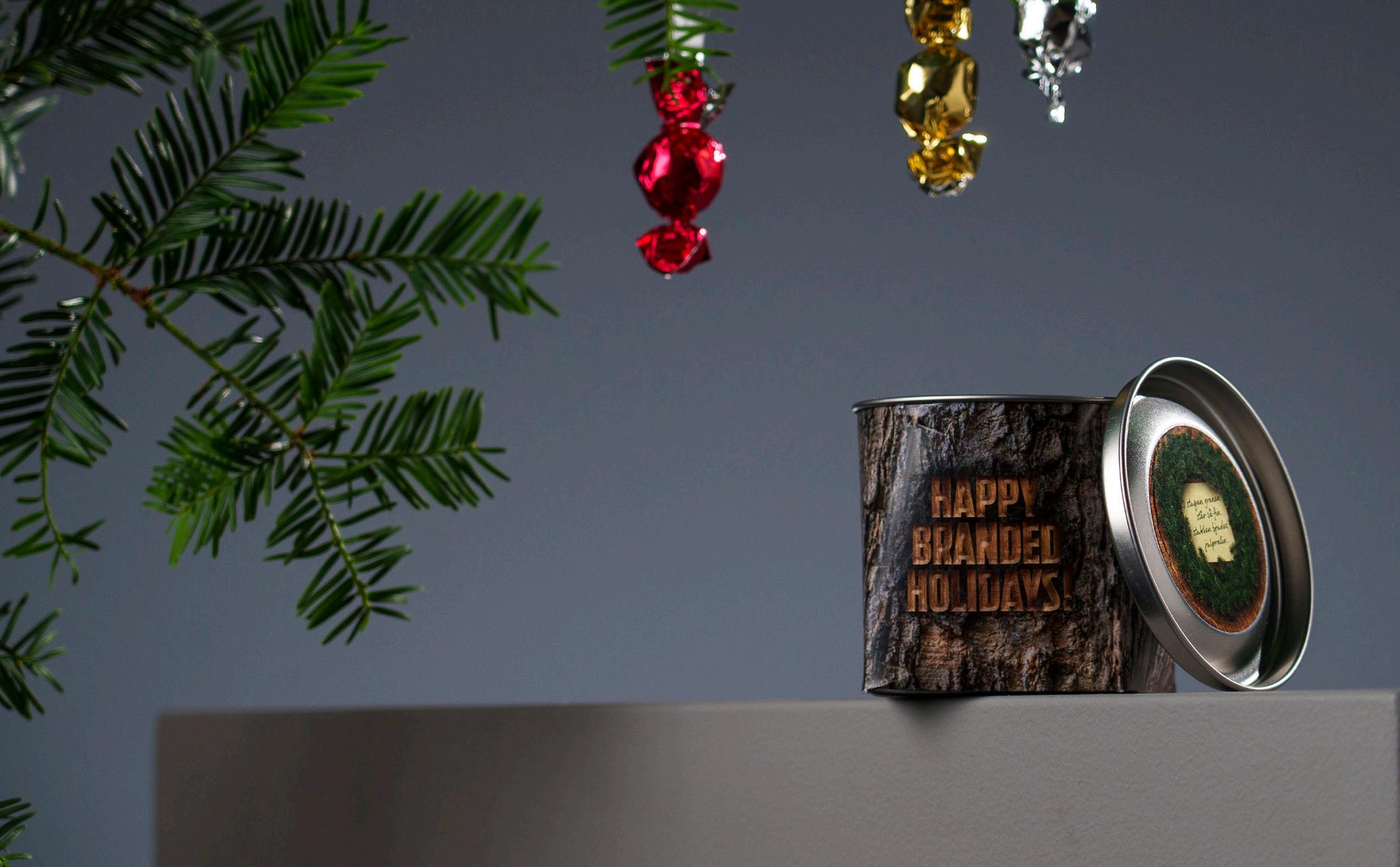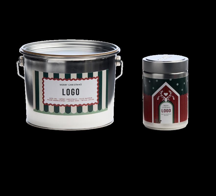 Gi bort en smakfull og minneverdig julehilsen! Våre dekorative metallbokser formet som små malingsspann kan fylles med akkurat det du ønsker – alt fra deilig sjokolade og karameller til mykt juleskum. Boksen leveres med egen etikett, slik at du kan profilere med firmalogo, julehilsen eller annet budskap.