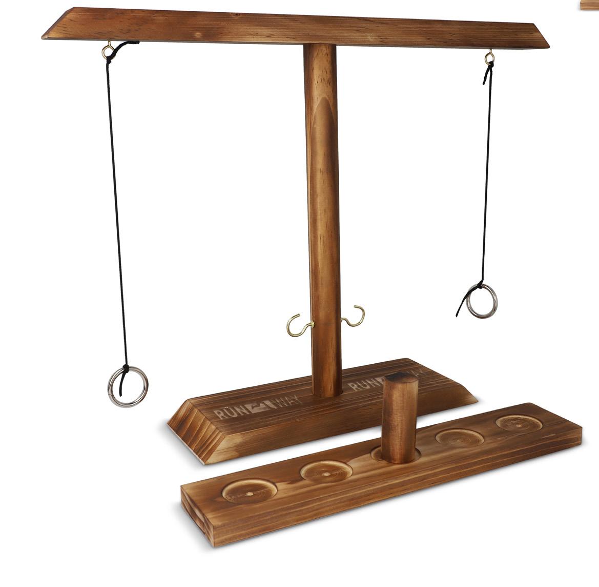 Ringkast-spillet er en tidløs utfordring for både store og små. Prøv å kaste ringen slik at den fester seg på kroken for å få poeng. Perfekt for både barn og voksne. Denne håndlagde treutgaven leveres med instruksjoner og kan gjøres personlig med en logo på resultattavlen.