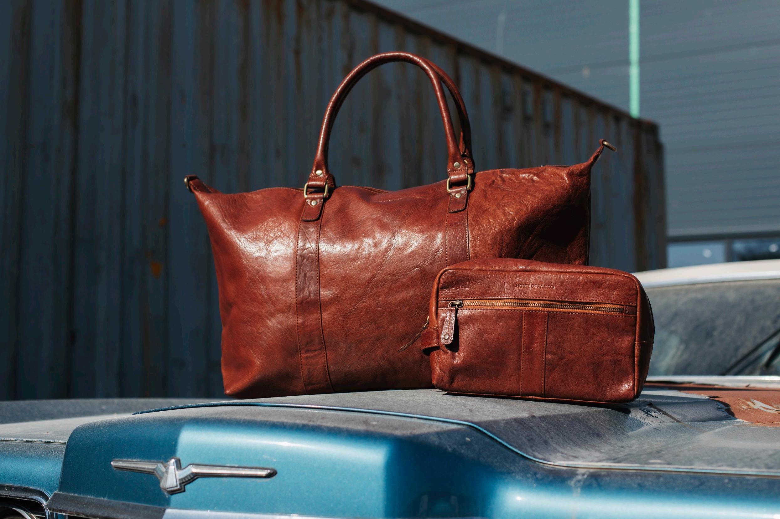 Weekendbag og toalettmappe i vegetabilsk garvet bøffelskinn fra House of Sajaco. Skinnet har litt større korn som gir et tøft uttrykk, eldes elegant og gjør veskene til livslange følgesvenner. Prisen er god, så kjøp gjerne begge som et sett.