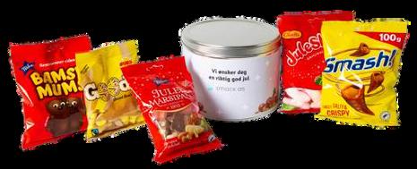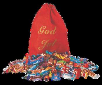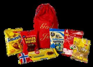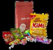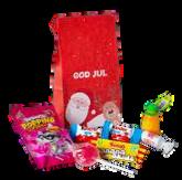 Innhold: Melkesjokolade 220 g, Bamsemums 115 g, Cloetta Juleskum 100 g, Goody 90 g, Walkers 150 g, Smash 100 g, Kims salt crunch 30 g, Crispo plate 65 g, Marsipan og sjokoladepose Nidar 130 g Pakkes i rød striesekk med teksten God Jul