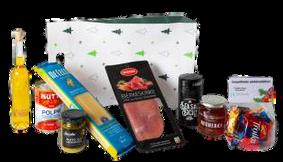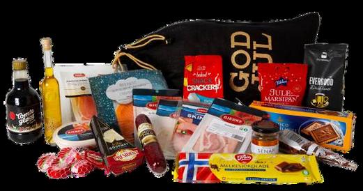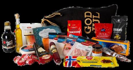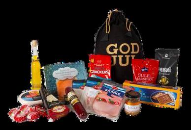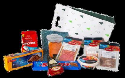 Innhold: Røkt laks skivet 100 g, Kalkunbryst marinert 80 g, Ribberull skivet 100 g, Oliven olje naturell nr 1 100 ml, Evergood Dark Roast filtermalt 250 g, Snack Crackers Salted 100 g, President Gourmet Brie 200 g, Marsipan og sjokoladepose Nidar 130 g, Sennep med tryffel 150 g, Bjerke Hummer & Rekesalat 180 g, Bjerke Bøkerøkt skinke 120 g Babybel i nett 120 g, Rødvinspølse 200 g, Choco Petit-Beurre 150 g, Serranoskinke skivet 80 g, Julegløgg 0,5 l, Holmsens Brente mandler 100 g, Melkesjokolade 220 g, Grillet svinekam 80 g