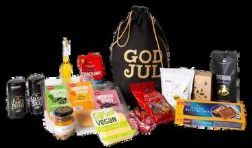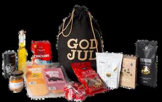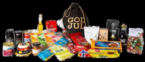 Innhold: Vegalami 90 g, Kvernet pepper skivet pålegg 100 g, Sea Salt 250 g, Oliven olje naturell nr. 1, 100 ml, Evergood Dark Roast filtermalt 250 g, Snack Crackers Salted 100 g, Julete Crema 200 g, Marsipan og sjokoladepose Nidar 130 g, Babybel i nett 120 g, Sennep med Tryffel 150 g, Oliven Iliada grønn uten sten 120 g, Black Pepper Crushed 90 g, Go'Vegan Original Synnøve 200 g, Vegetar Pålegg sprek jalapenjo 80 g, Choco Petit-Beurre 150 g Pakkes i sort striesekk med teksten God Jul